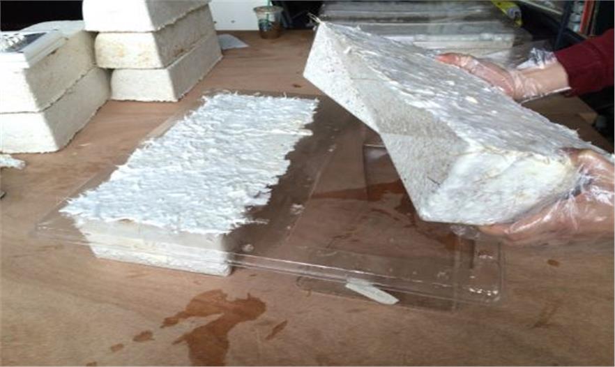 磚塊首先放在霉菌環(huán)境下生長,五天后軟軟的有機質(zhì)就會長成堅硬的磚塊。一塊45.7厘米*22.8厘米*10.2厘米的磚塊僅重1磅(0.45公斤)——不過同樣足夠耐用。