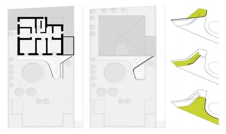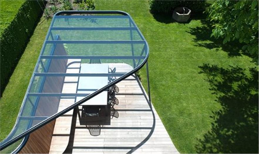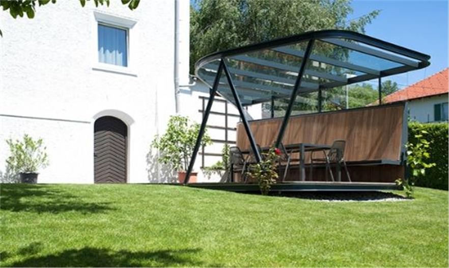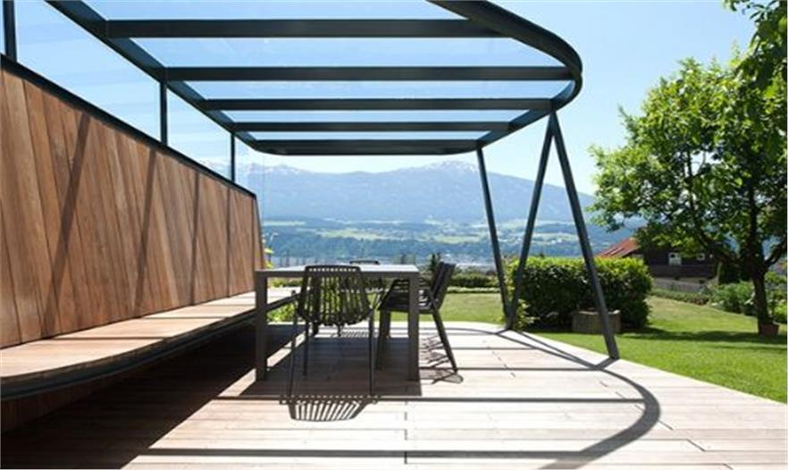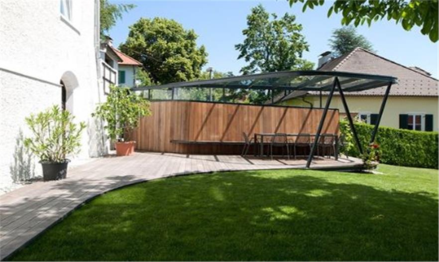 在因斯布魯克一座別墅前,mario gasser重新設(shè)計(jì)了一個(gè)鋼結(jié)構(gòu)屋頂平臺,該設(shè)計(jì)充分利用現(xiàn)有資源,將分隔于別墅外的這個(gè)平臺設(shè)計(jì)得簡明流暢。平臺與別墅有一定距離,故此不遮擋這座住宅的外貌,并環(huán)繞中央?yún)^(qū)域核桃樹一角。由于平臺位于一個(gè)略微傾斜的地塊之上,平臺一端略高于草坪。一側(cè)的木質(zhì)墻板可作為隔板,同時(shí)也是集成座位的靠背。鋼結(jié)構(gòu)頂部玻璃屋頂為平臺創(chuàng)造較為私密的空間,也可以遮風(fēng)擋雨。