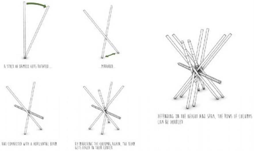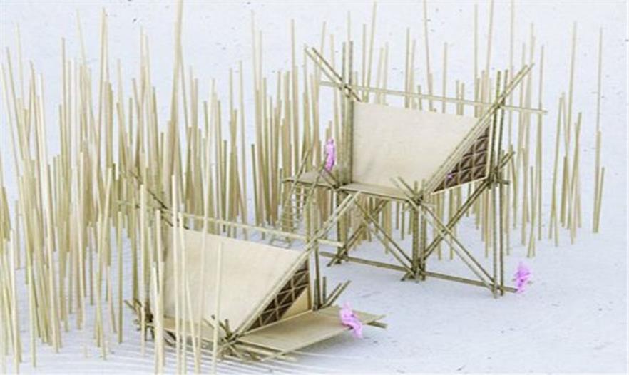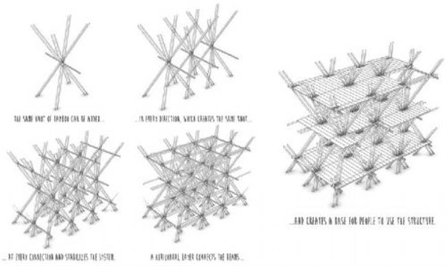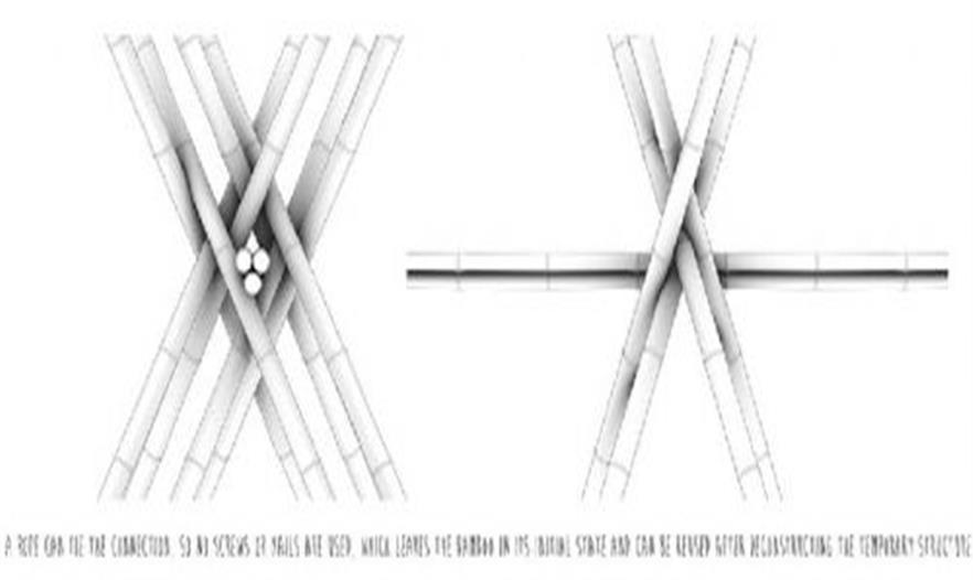 該方案的單元跨度為4.7米,每個關(guān)節(jié)與八個結(jié)構(gòu)桿相連,是整個結(jié)構(gòu)能夠承受大負(fù)荷。系統(tǒng)通用性意味著必要時可以增加更多的竹屋帳篷,只要有足夠的關(guān)節(jié)用以實現(xiàn)結(jié)構(gòu)穩(wěn)定性。