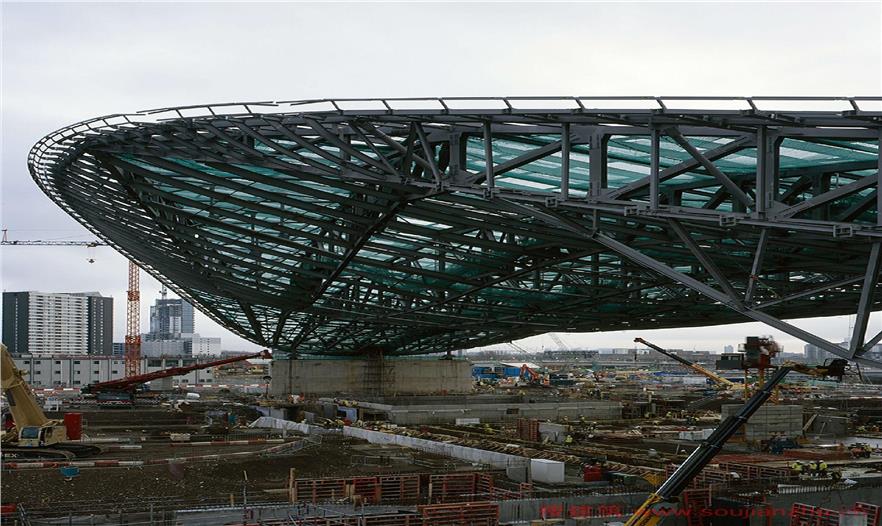 水上中心計(jì)劃在一個正交軸垂直于Stratford市大橋。沿著這條軸線奠定了三個水池。訓(xùn)練池位于橋下而競爭和跳水池在大體積的水池大廳里??傮w戰(zhàn)略是框架的基礎(chǔ)池大廳周圍的平臺上連接著橋。