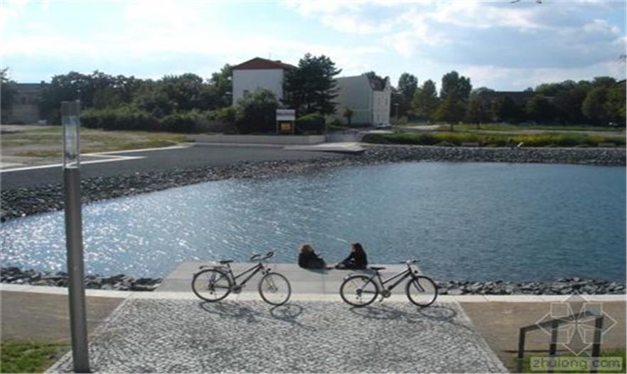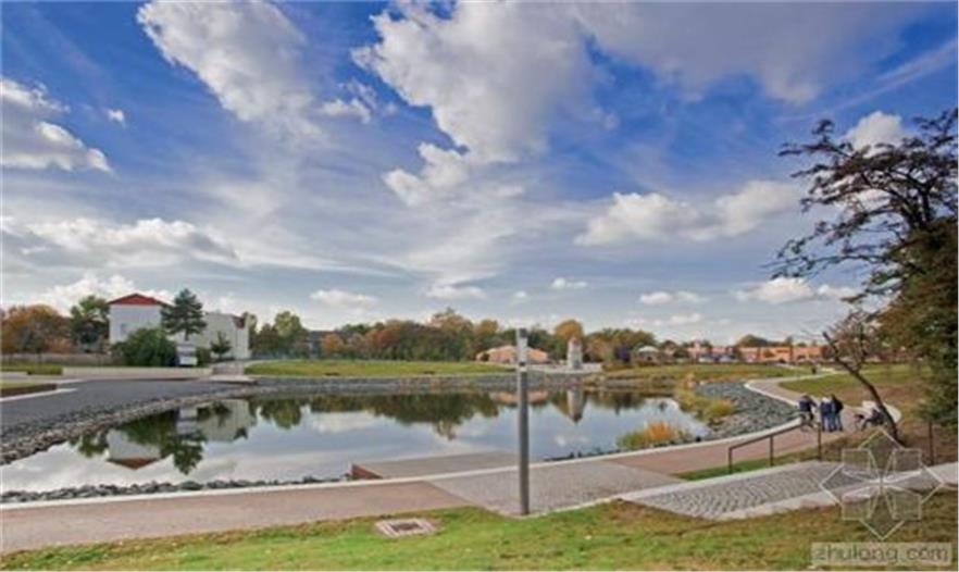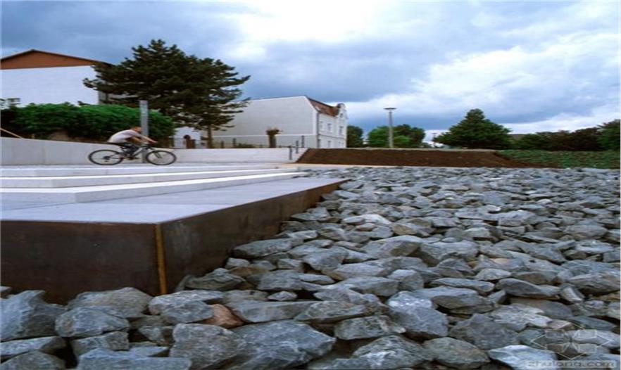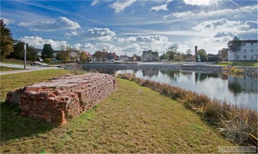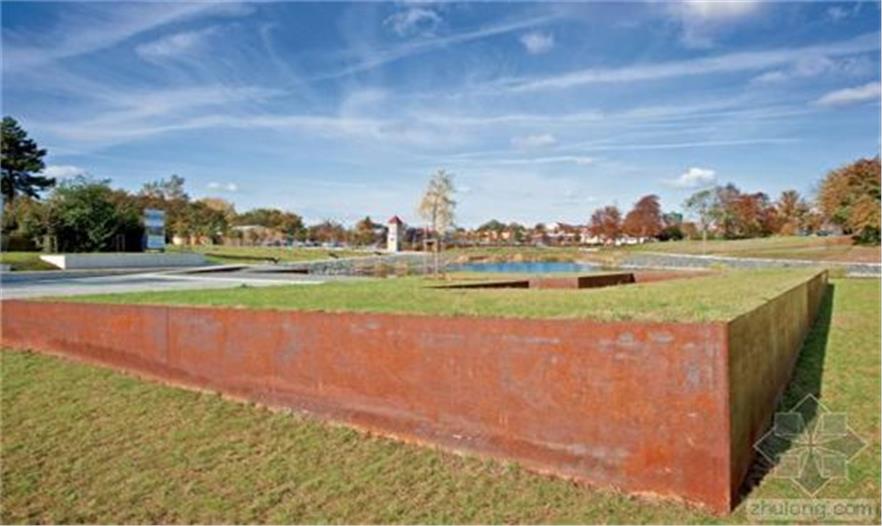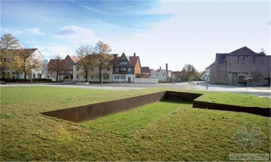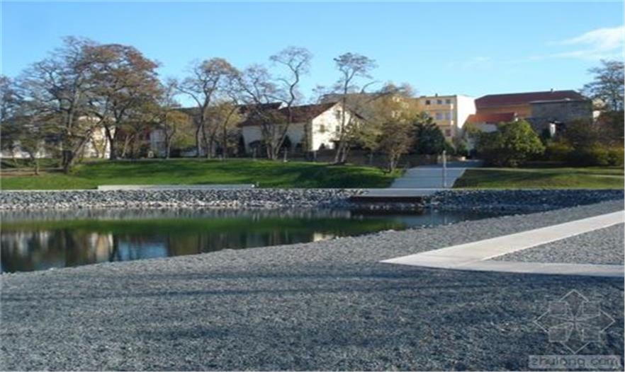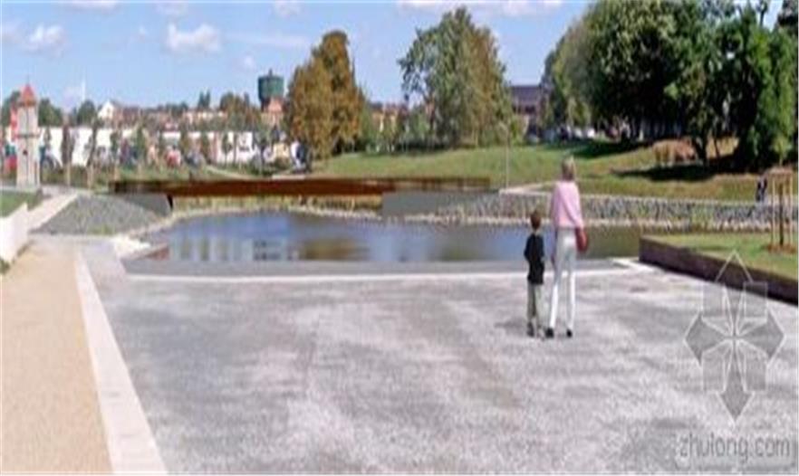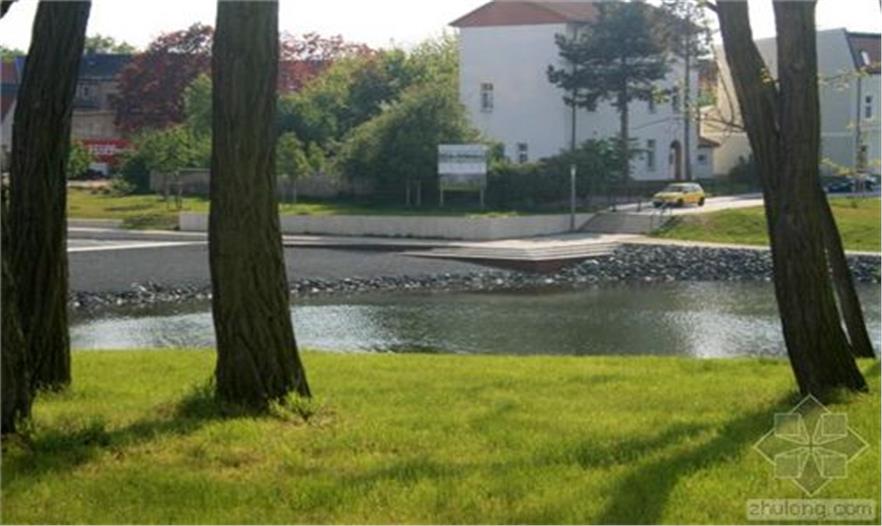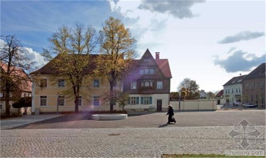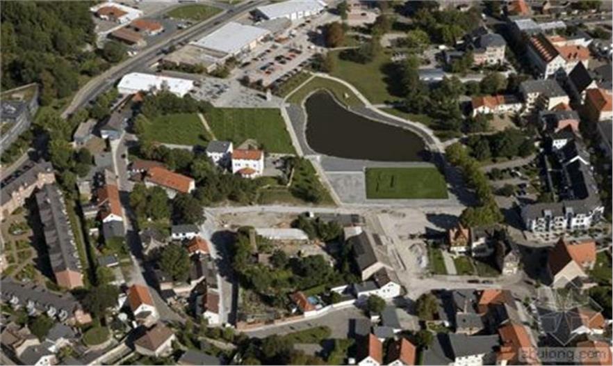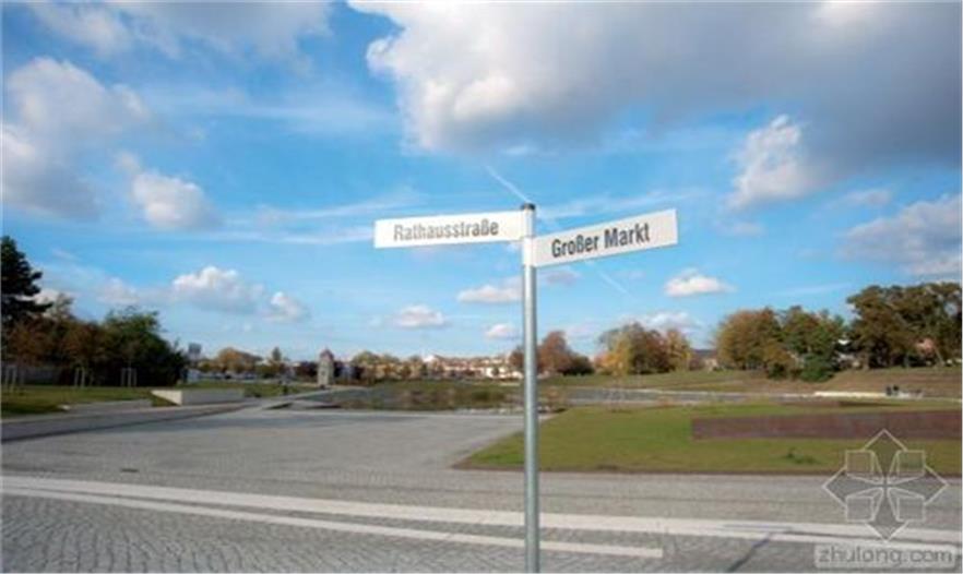 隔離帶被設(shè)計(jì)為一個(gè)區(qū)域整體,與湖、市場(chǎng)和先前教堂所在地融合。市場(chǎng)是一個(gè)礫石床平面。與教堂北相鄰的地方是St. Johannis教堂的遺跡和地基位于其50厘米下方的“斜塔”,未來(lái)幾十年它們都不會(huì)受到影響。這個(gè)地方被設(shè)計(jì)成一片寬闊的草坪。這個(gè)草坪是未來(lái)任何可能的改造的標(biāo)準(zhǔn)。草坪內(nèi)傾斜的表面標(biāo)志著小城過(guò)去500年的地標(biāo)——前教堂的所在地。