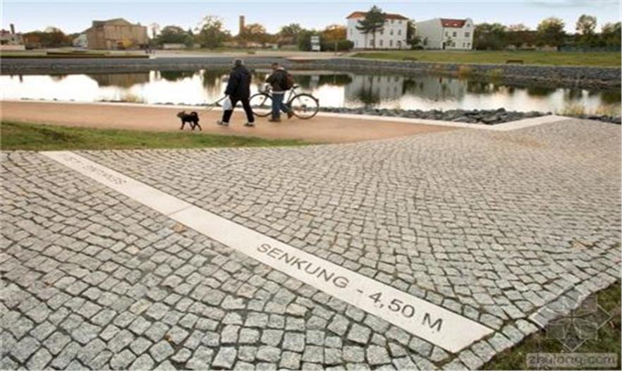 德國(guó)Staßfurt小城中心的居民們不難發(fā)現(xiàn)其礦產(chǎn)業(yè)的擴(kuò)展。大約150年來(lái),城市下方豎井中挖掘出了大量鉀。在這些豎井關(guān)閉之后,人們用水和土裝填充它們。這導(dǎo)致地面最多下降了7米之多。當(dāng)?shù)卦O(shè)計(jì)了分布式的排水系統(tǒng)防止地面再次下降。最終形成一條面積4500平方米的湖,它既反應(yīng)了當(dāng)?shù)氐牡V業(yè)歷史,還促進(jìn)了市政建設(shè)。水中的沉淀物不禁讓人想起帶給這座城市繁華的水晶鹽,同時(shí)讓人感嘆歷史一去不復(fù)返:街道也變成了水上的平臺(tái),使人清晰地回想起一切。這片區(qū)域的東西交匯處Kottenstrasse依然可供行人和自行車(chē)通行。