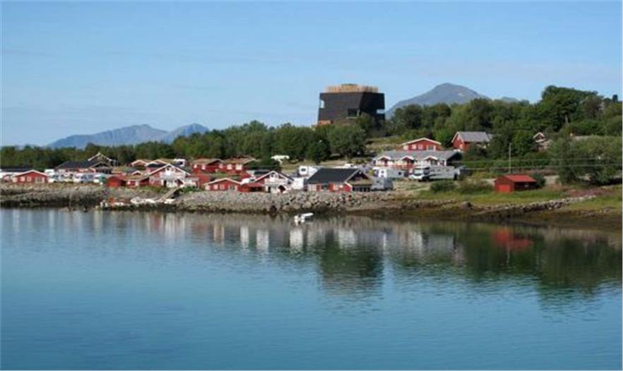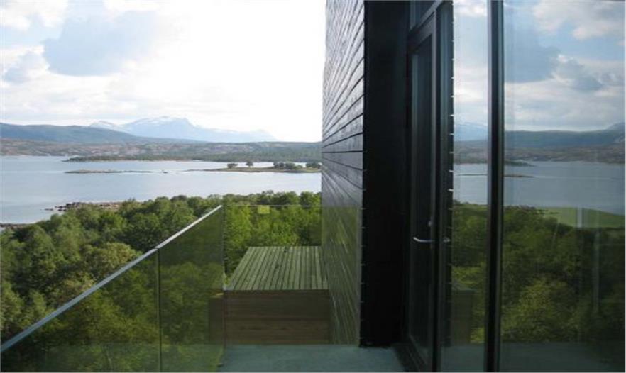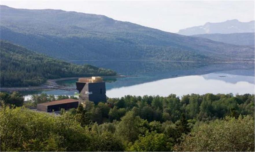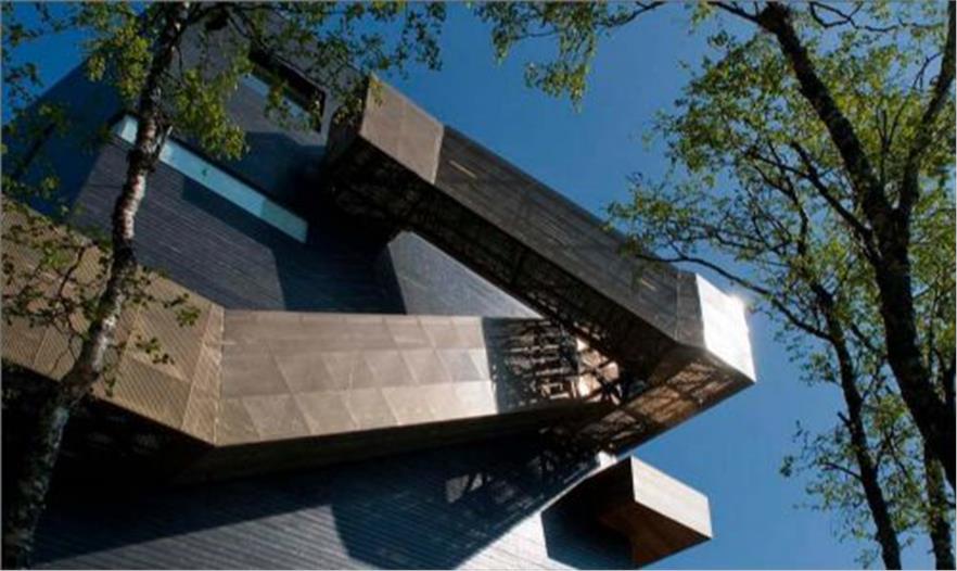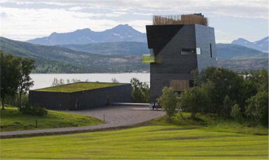 Knut Hamsun Centre位于湖邊,四周群山環(huán)抱,典型挪威峽灣風貌,建筑分為一高一矮兩部份,高的塔樓為展館,矮的那部份為報告廳,整個房子外立面材料主要為黑色木材,被風化后更與周圍景色相協調,體量和色彩也不突兀,掩映在群山樹林之中。