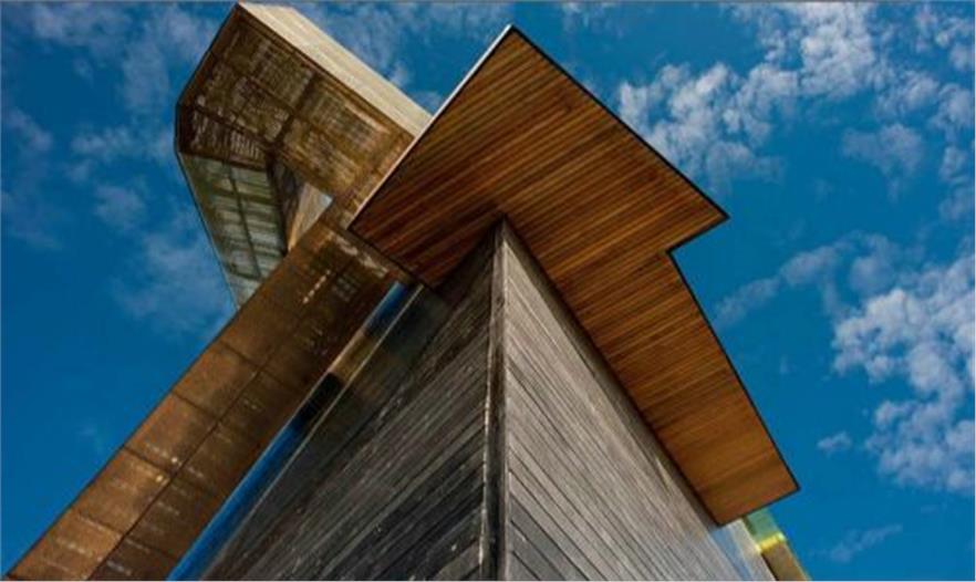焦油般的黑木外墻契合了挪威中世紀的木板教堂;在屋頂花園,長長的竹子斜槽代表著挪威傳統(tǒng)的草皮屋頂。禮堂通過一條走廊連接至主要建筑,該走廊經過一座較低的前廳,充分利用自然地形優(yōu)勢將自然光引入室內交通線。