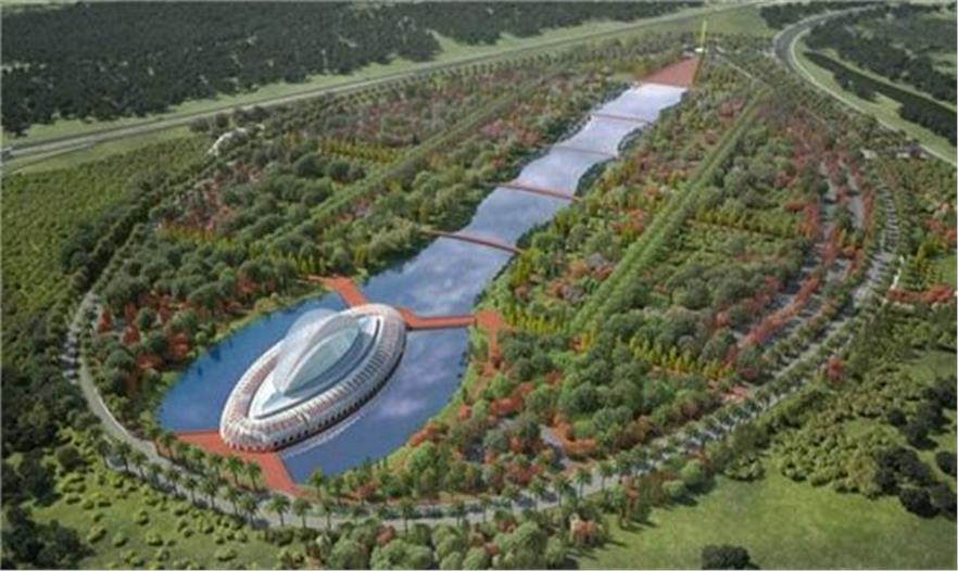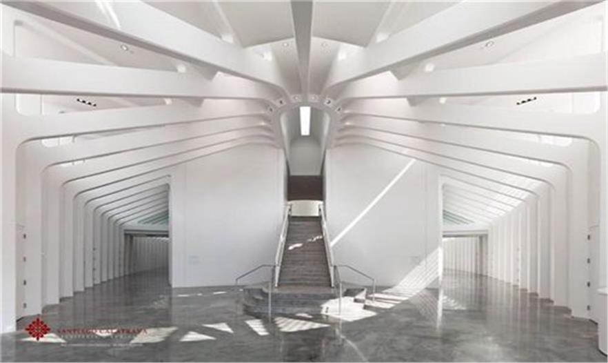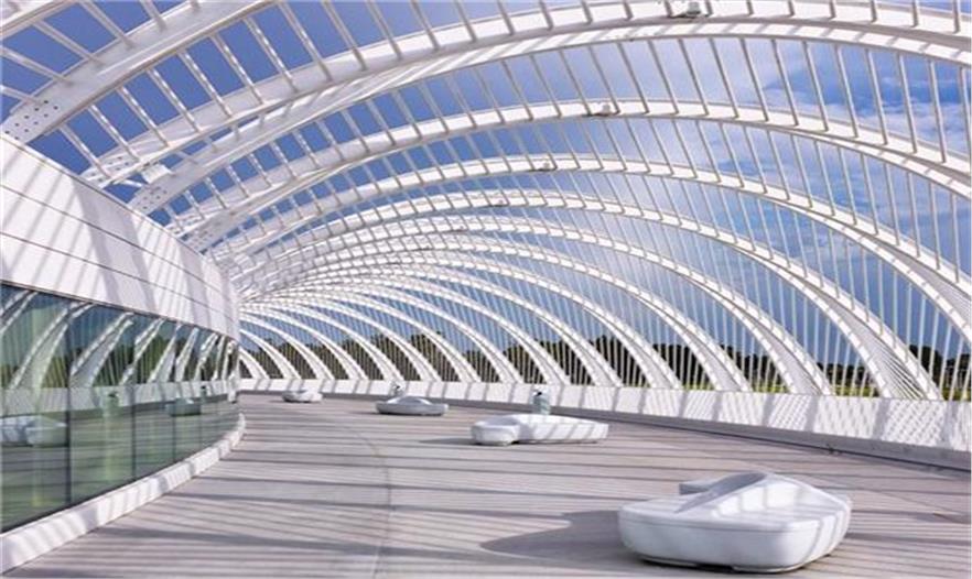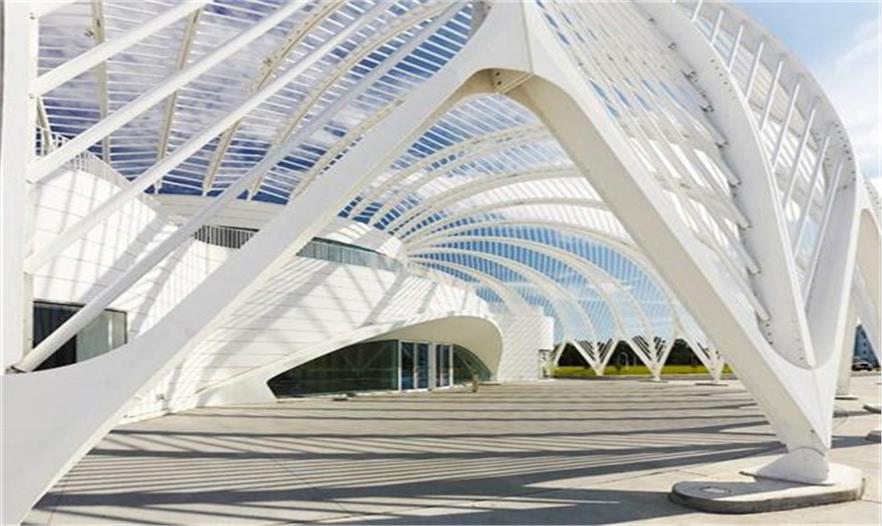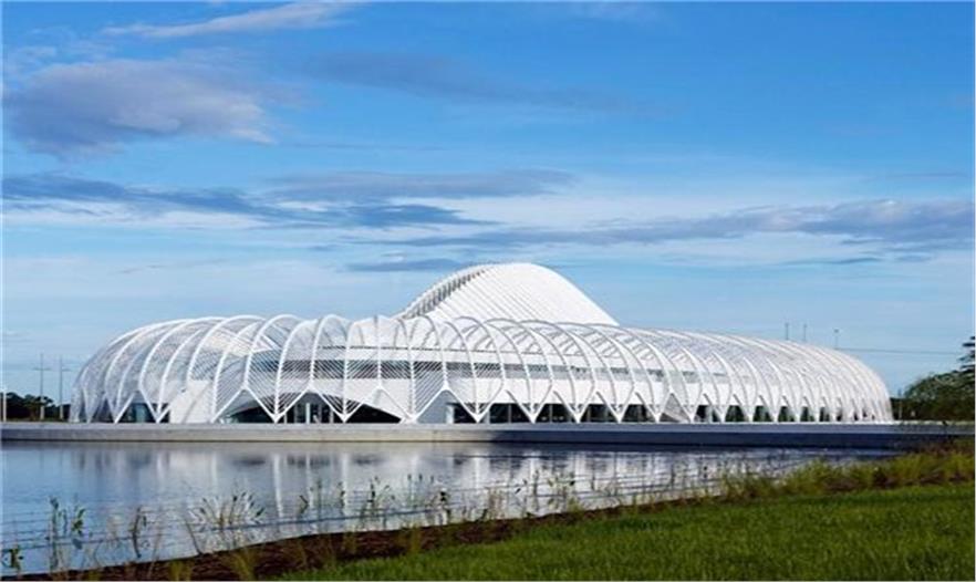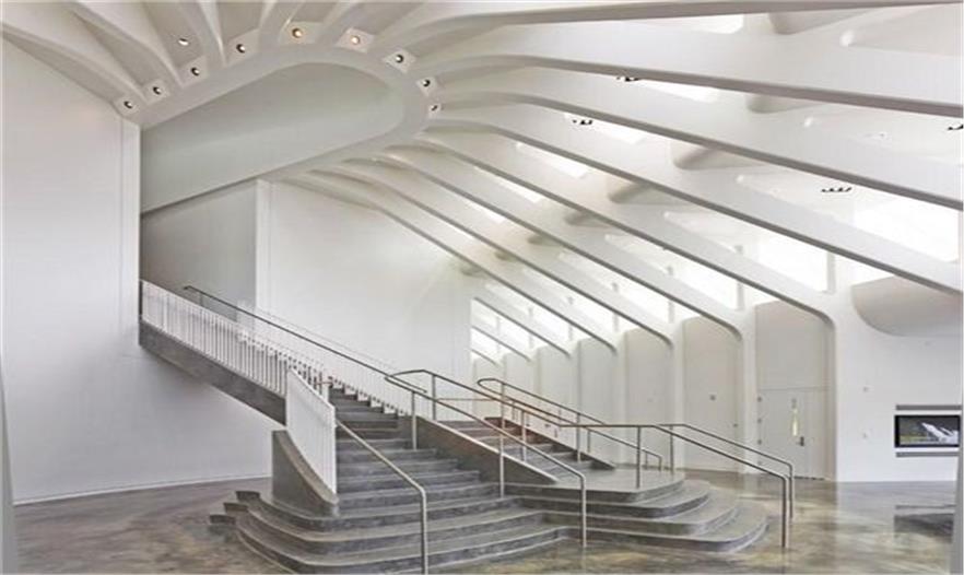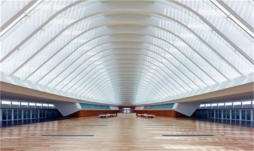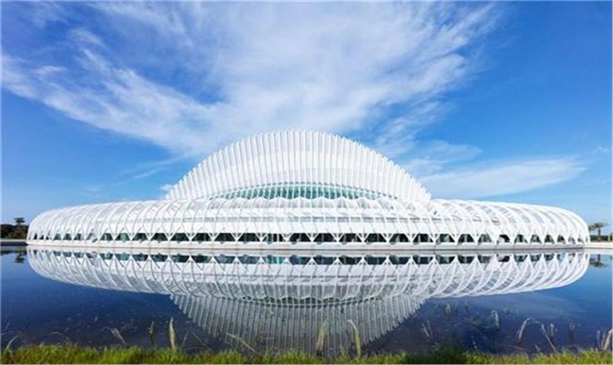 建筑由輕質(zhì)鋁、水 泥、玻璃打造而成。屋頂由混凝土及鋼筋排列成拱形的骨骼狀結(jié)構(gòu),然后向底層呈放射狀延伸出46片鋁制的百葉窗,使建筑體經(jīng)由湖面的光影映照,就像一艘降落在地球表面的白色太空飛船,閃閃發(fā)光...