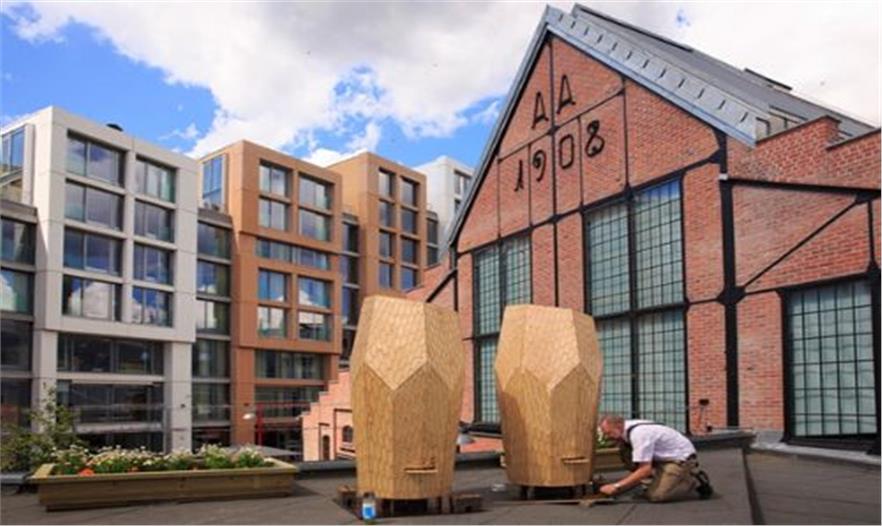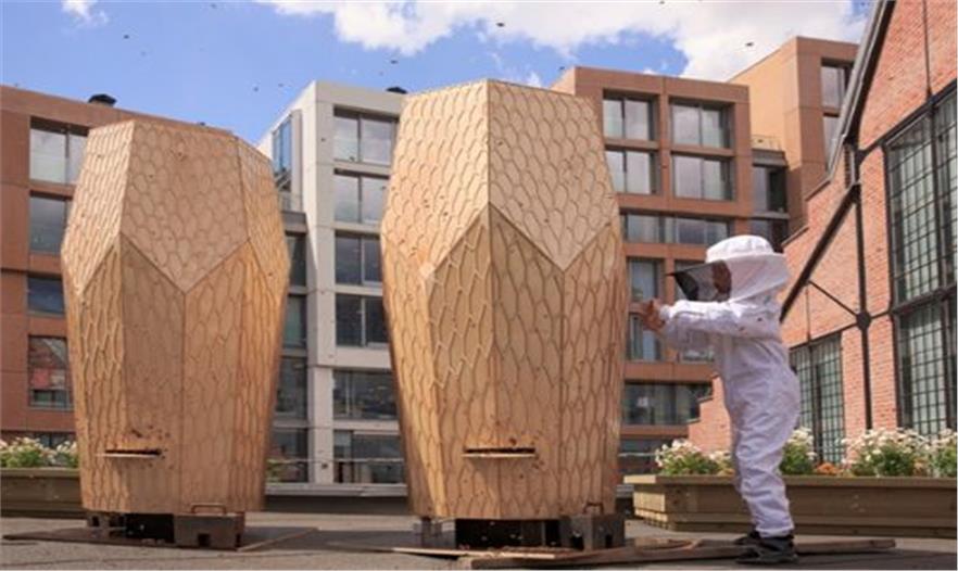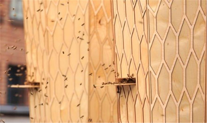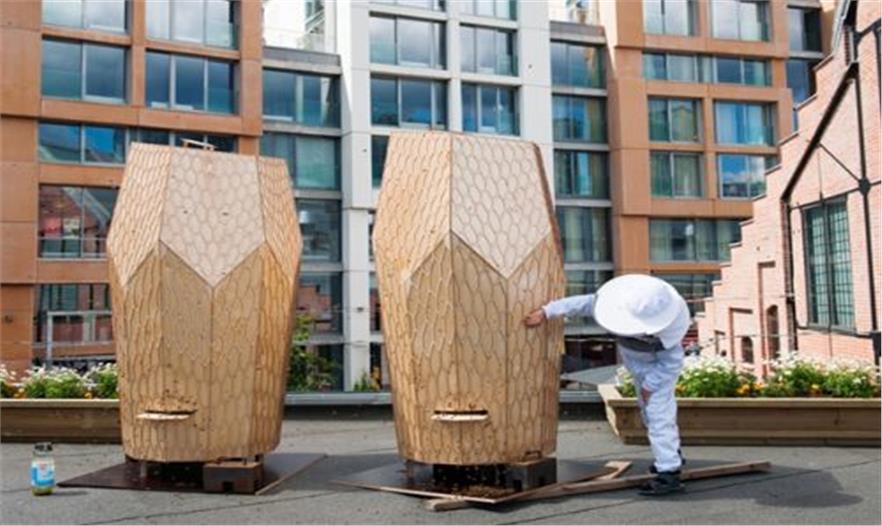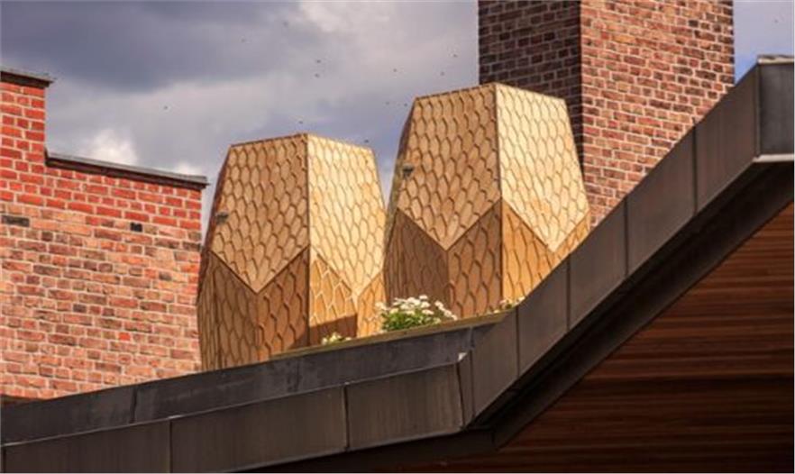 為促進(jìn)挪威首都奧斯陸?zhàn)B蜂業(yè)和植物授粉的發(fā)展,snøhettahas建筑事務(wù)所設(shè)計(jì)制作了vulkan蜂箱,并將其放置于毗鄰mathallen食品大廳的屋頂上。vulkan蜂箱置身于城市美食中心和茵茵綠地之間,其結(jié)構(gòu)形式和圖案借鑒天然蜂房組織,表面通過六角形嵌板接合而成。由于整個(gè)蜂箱的木質(zhì)空間高于屋頂欄桿,路人從其下的街道即可觀察到該“大型蜂房”。