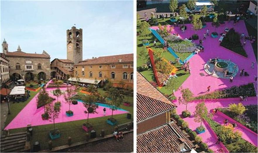 意大利貝加莫的維基亞廣場(舊廣場)是一個復(fù)興廣場,柯布西耶稱為“歐洲最漂亮的廣場”。2014年9月在貝加莫召開了一個重要的國際景觀專題討論會Arketipos,而維基亞廣場的蛻變是其關(guān)鍵的部分,這個歷史性的廣場經(jīng)過兩個星期的時間轉(zhuǎn)變成一個戶外客廳,吸引了成千上萬的居民和游客前來參觀。