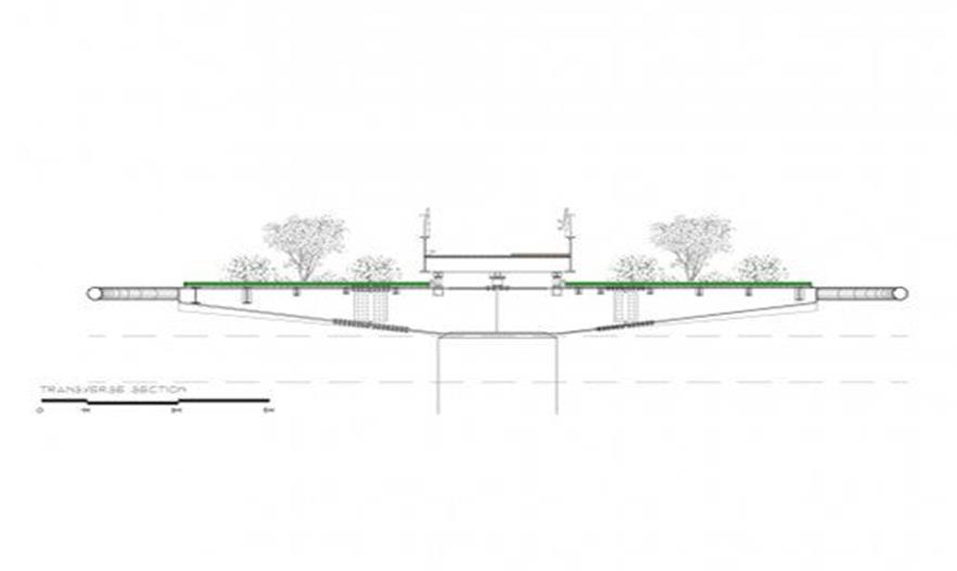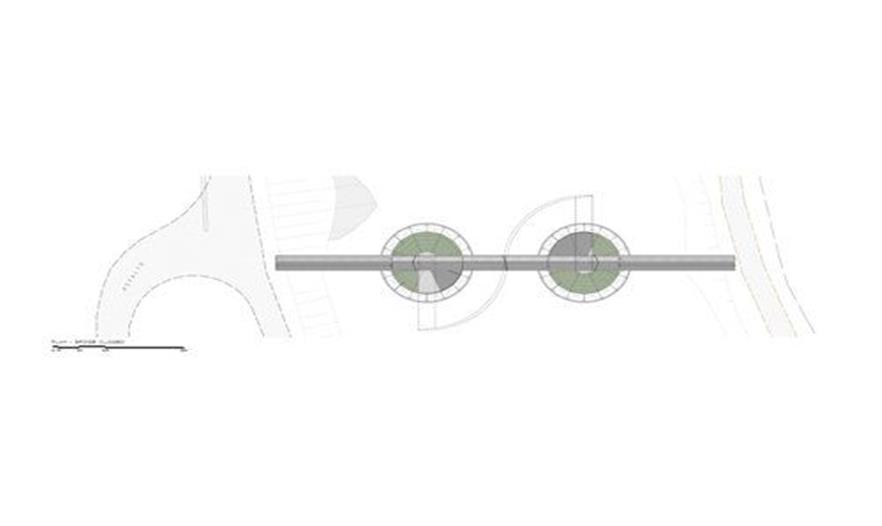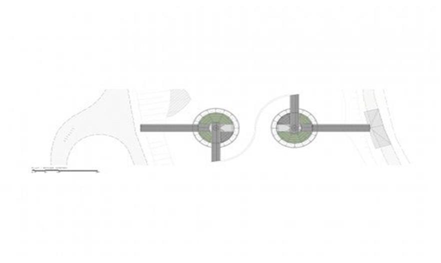 除了連接運(yùn)河的兩岸之外,該橋提供了一個(gè)觀賞景觀的地方。兩個(gè)金屬制的小島坐落在混泥土石墩上,作為90米長(zhǎng)大橋的支撐。這些金屬制島嶼被植物覆蓋著,選用睡蓮,是對(duì)項(xiàng)目概念的參考。