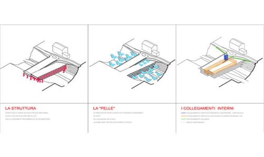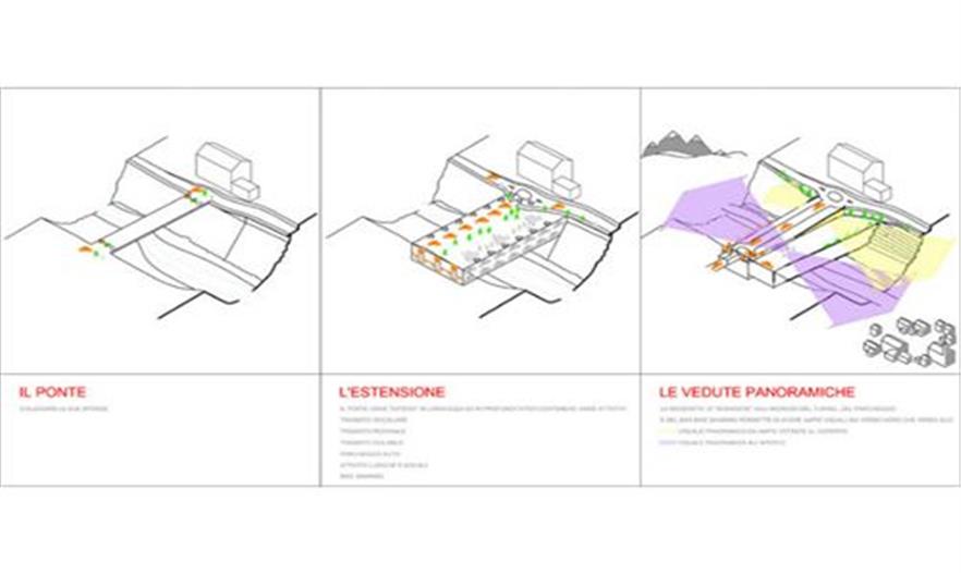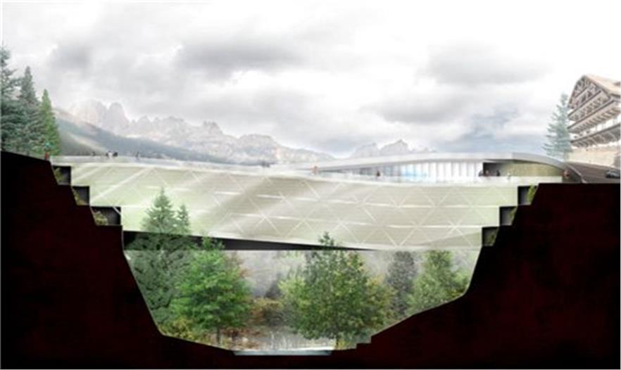意大利Moena山城需要一個新的停車場和橋,而且原始的方案需要大量的挖掘作業(yè),對環(huán)境破壞比較大。AS-DOES的安吉洛·薩拉莫內(nèi)以及蘿塞拉·迪·巴里提出了一個更加可持續(xù)性的解決方案,他們提議運(yùn)用預(yù)制施工把停車場隱藏在橋里面,這樣只需要小量的挖掘作業(yè),能保護(hù)脆弱的生態(tài)系統(tǒng)。橋的一部分用于車輛,其他部分和綠色屋頂置于頂部,作為徒步者、騎自行車的人以及游客的主要通道。這座橋滿足了城市停車以及交通的所有需求,而且還提供了一個漂亮的、可持續(xù)性的以及有意義的聚集空間。