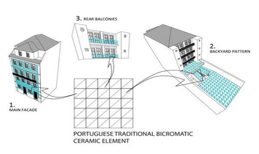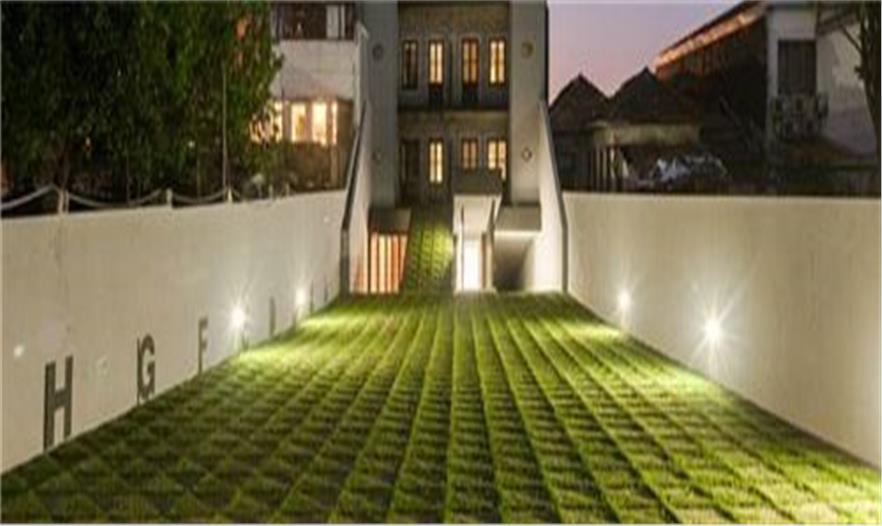 傳統(tǒng)的二色性結(jié)構(gòu)是漂亮的且富有功能的,連接著外部空間以及內(nèi)部的正面空間。建筑的后面以及其中一個住宅的頂部是庭院,全部用于停車。這個庭院包括三角草坪,重復(fù)了建筑外觀瓷磚的形式。
