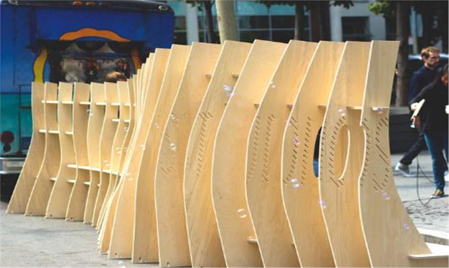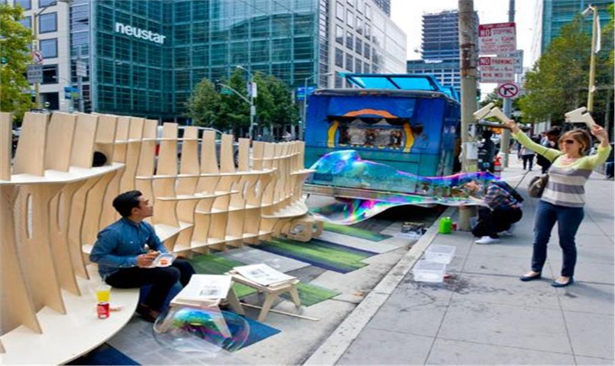 舊金山——對于SPUR的公園日裝置來說,游客能接觸到五顏六色的藝術(shù)材料,來創(chuàng)造一幅在人行道以及街上的畫面。游客的藝術(shù)作品在以交通和辦公大樓的背景下,在SPUR的彈出式公園里展出。