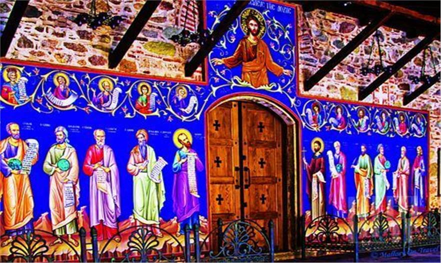 離k村最近,始建于1388年,二戰(zhàn)期間遭到劫掠和破壞而日漸頹敗,1960年當?shù)卣匦峦顿Y修繕。由于坐落的巖石面積不大,設(shè)計緊湊,與山巖幾乎融為一體,堪稱建筑設(shè)計奇跡。壁畫是希臘著名畫家塞奧法內(nèi)斯1527年繪制,是迄今能見到有其簽名的最古老的壁畫。周五不開放。