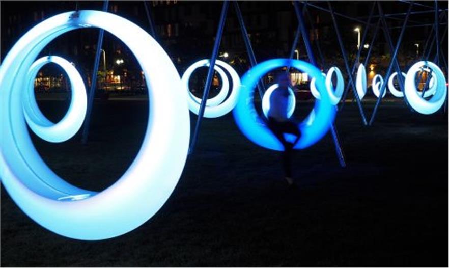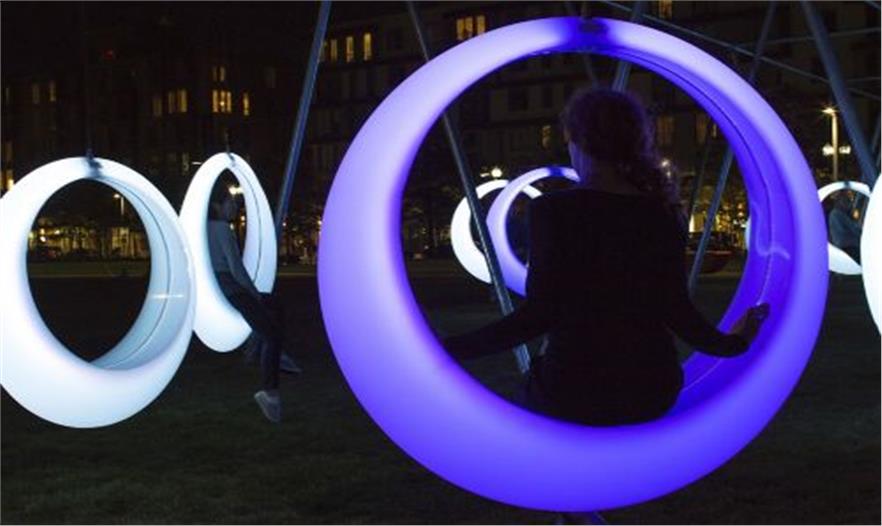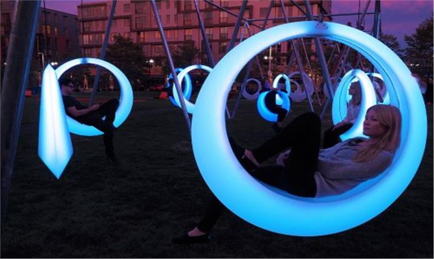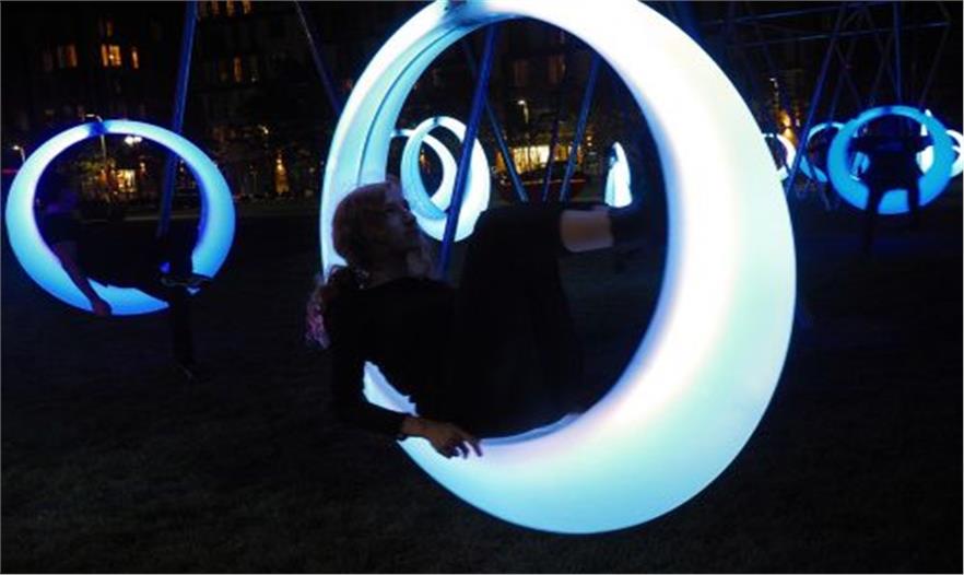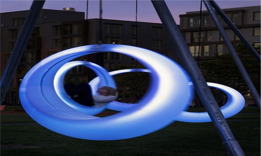 在波士頓,運動場不再只是孩子們的地方。20個LED發(fā)光的圓環(huán)形秋千安置在戶外,作為“Swing Time”的一部分,這也是波士頓第一個互動的雕塑裝置。這些懸掛的、發(fā)光的環(huán)形秋千是傳統(tǒng)的橡膠圈—繩索組合的創(chuàng)新,懸掛于小型的鋼鐵結構上,和傳統(tǒng)運動場上用的鐵架相似。LED燈嵌入到秋千里面,隨著秋千的晃動,里面的燈會變換顏色,靜止的時候會變回到昏暗的白色。
