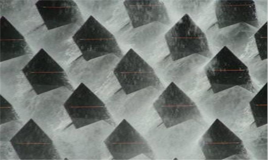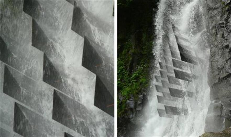 Gongora把鋼鐵三角形安裝在8米高的鉆石結(jié)構(gòu)中,其尖狀結(jié)構(gòu)與落水融合,轉(zhuǎn)移周圍的急流。Gongora設(shè)計(jì)了一些固定框架的幾何體,防止流水沖垮。有人認(rèn)為藝術(shù)家設(shè)計(jì)的三角架是用來保持平衡的,緊緊的穩(wěn)固框架但依然受大自然母親的鐘愛。藝術(shù)作品的名字,Les Cascadeurs翻譯成了“特技演員”,也與法國的單詞“瀑布”有關(guān)。鋼鐵尖被染成黑色,這樣會與當(dāng)?shù)厥^相符合,固定在水下面的鋼鐵底座上。每個(gè)尖頭下面的水平堤壩是為膽大的野生物提供的避身所。每個(gè)屋頂下面有一個(gè)小型的木質(zhì)休息所,為“特技小鳥”來此處休息做準(zhǔn)備。Gongora和兩個(gè)爬山者一起工作了三天,在該位置頂端的石頭和樹上用六條鐵索懸掛這個(gè)結(jié)構(gòu)。該作品是為一年一度的Horizons Sancy藝術(shù)節(jié)和2012年的自然節(jié)建設(shè)的。