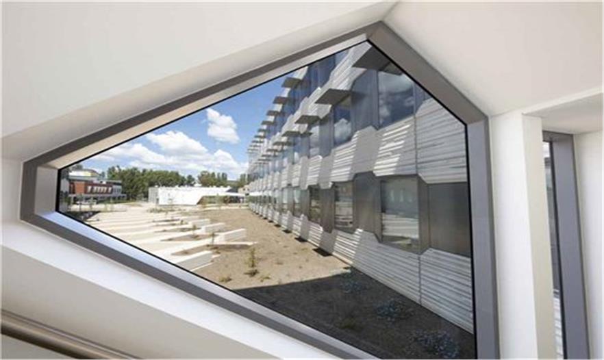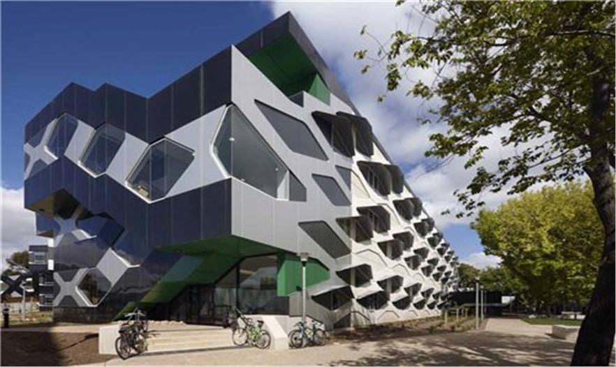 該項目位于該大學的??祟D校區(qū),項目將現(xiàn)有的兩個生物研究學校通過外立面上的六邊形窗和淺綠色的斑點在視覺上連為一體。