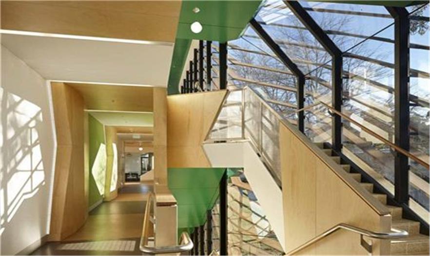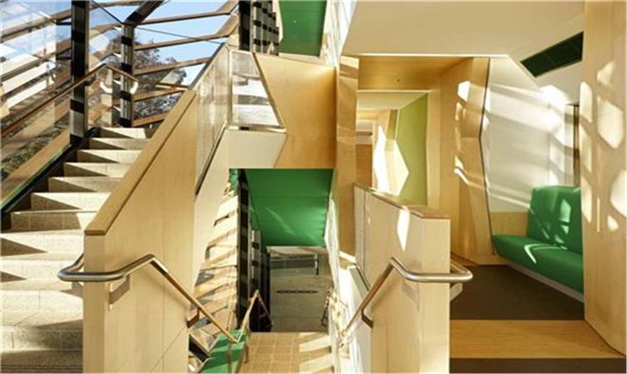 建筑師Carey Lyons說道:“兩座現(xiàn)有學校都有著非常棒的研究和教學設施,所以我們面臨的挑戰(zhàn)就是將這些設施集中在一座建筑內(nèi),并且組成一個新整體的同時還要保持各自獨立的特色。整座U形建筑西立面呈懸浮的交叉延伸,并在中間交叉部分創(chuàng)建出協(xié)同工作區(qū)和會議室。交叉形成的兩翼表明了它們各自獨立的身份,而交叉的樓梯、會議室又是結合在一起的,作為共用。”