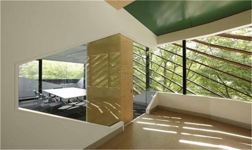 辦公室位于實驗室相對的一邊,每一層辦公室都有兩排窗,一排在與桌子齊平的高度,另一排則在靠近天花板的位置。