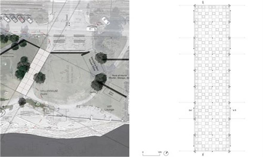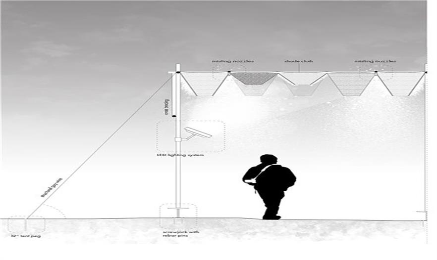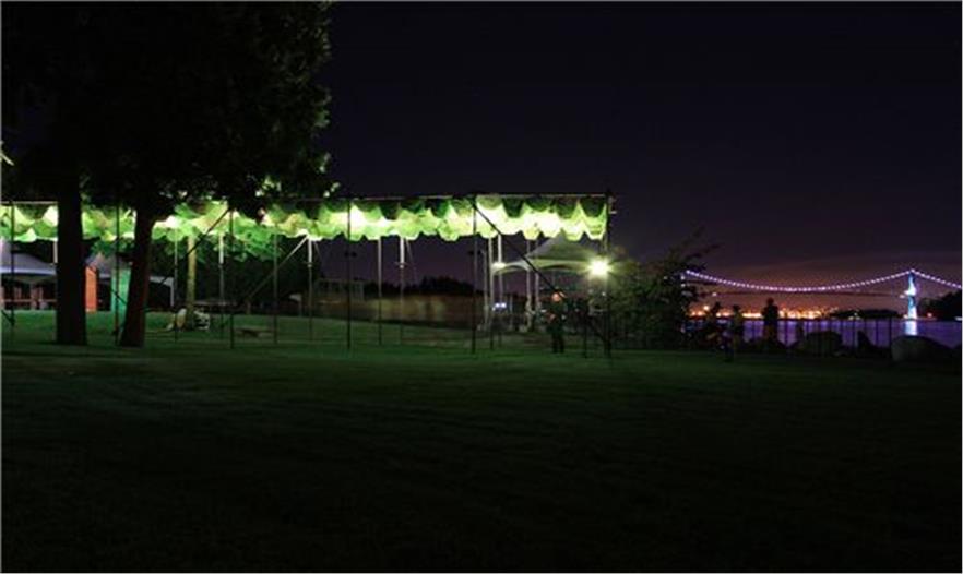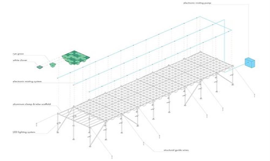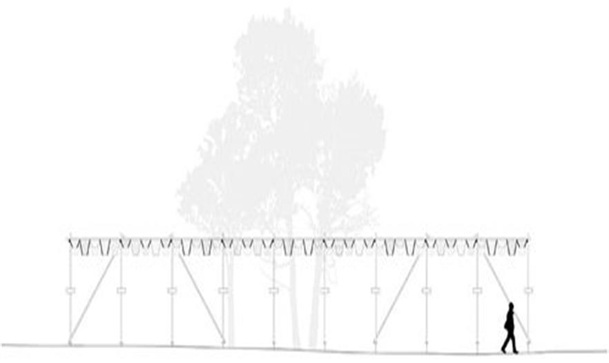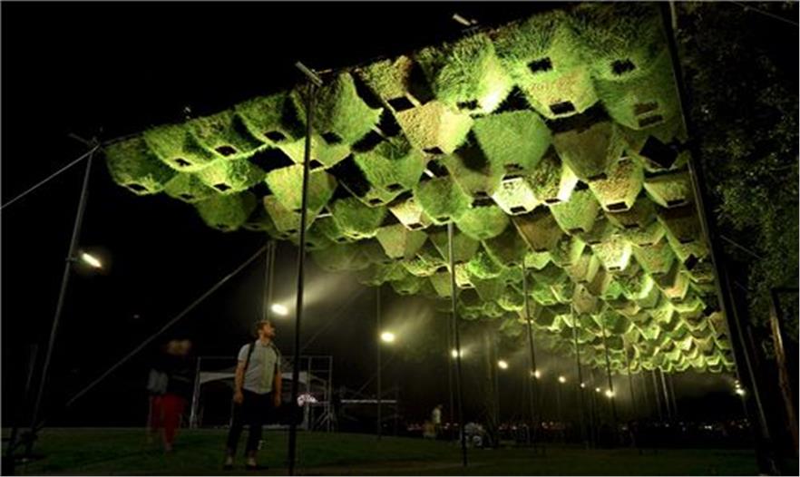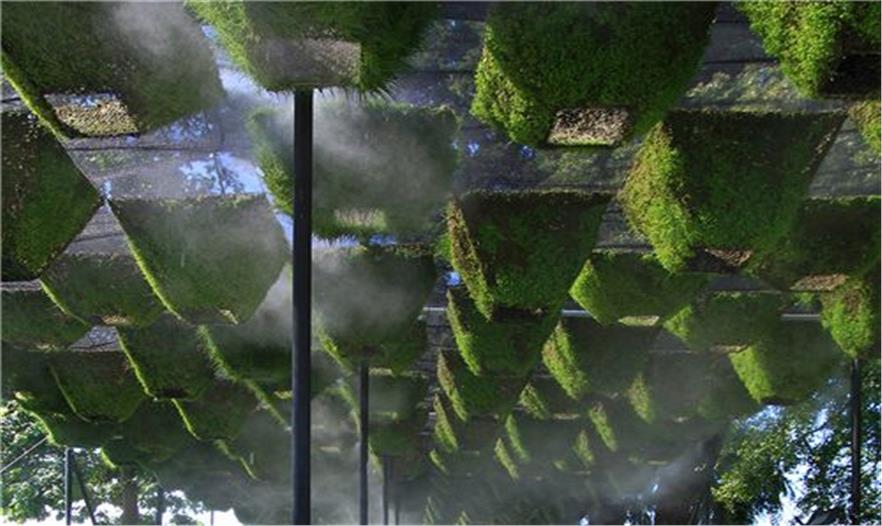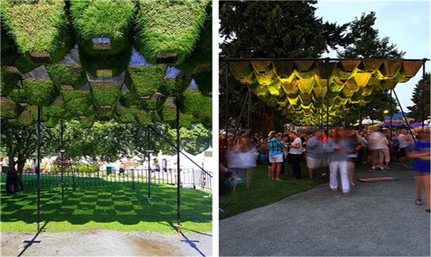 加拿大短暫而美麗的夏天里,Matthew Soules建筑事務(wù)所在溫哥華博物館門前安裝起一個(gè)臨時(shí)的植物裝置構(gòu)架,同時(shí)探討人工與自然的關(guān)系。這個(gè)構(gòu)架是一個(gè)長(zhǎng)條形的開放棚架,棚頂上有260個(gè)植草模塊,模塊上生長(zhǎng)的草是白三葉草以及多年生黑麥草。實(shí)現(xiàn)的方式為:將種子混合水、木漿、粘合劑(瓜爾豆膠--生物可降解的粘合劑)、特定的種子培養(yǎng)漿;然后噴在繃著10號(hào)細(xì)線做得鐵絲網(wǎng)+能夠有利于植物生長(zhǎng)的土工布的金字塔形植草模塊上,一半噴白三葉草,一半噴黑麥草。然后放置30天,進(jìn)行澆水和施肥,讓其生長(zhǎng),最后再將這些模塊吊裝起來,安置在草坪上,在炎炎夏日中為人們提供蔭涼。配套的噴霧器系統(tǒng)在滋潤(rùn)與灌溉植物的同時(shí),也降低小片區(qū)的問題,并與LED燈光結(jié)合,形成朦朧的夢(mèng)幻效果。