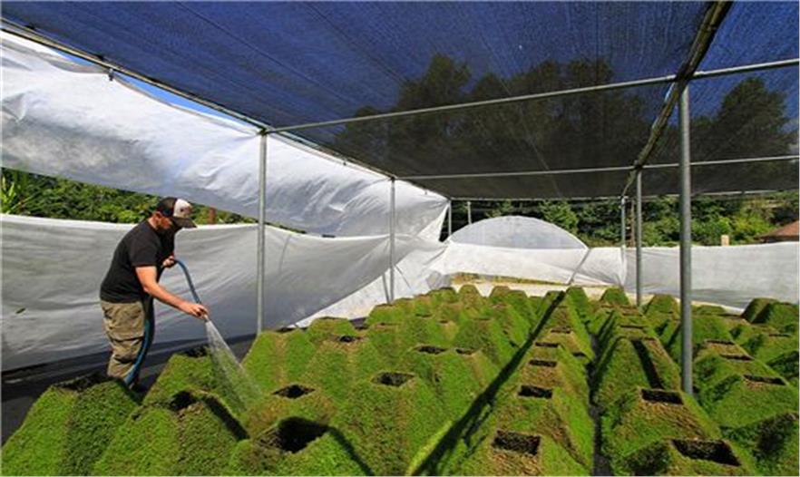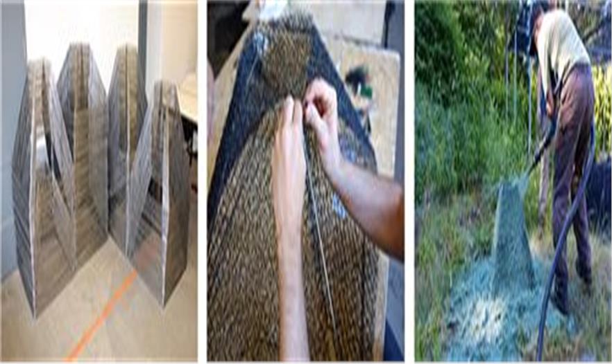 實(shí)現(xiàn)的方式為:將種子混合水、木漿、粘合劑(瓜爾豆膠--生物可降解的粘合劑)、特定的種子培養(yǎng)漿;然后噴在繃著10號(hào)細(xì)線做得鐵絲網(wǎng)+能夠有利于植物生長(zhǎng)的土工布的金字塔形植草模塊上,一半噴白三葉草,一半噴黑麥草。然后放置30天,進(jìn)行澆水和施肥,讓其生長(zhǎng)。