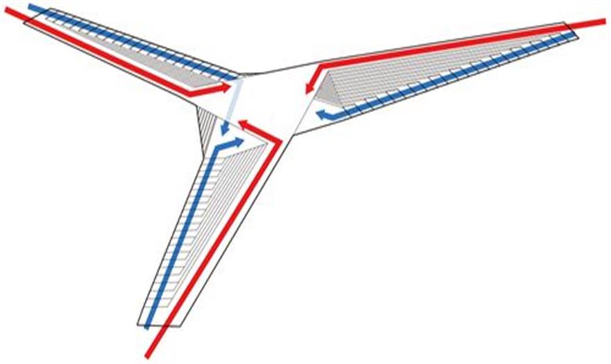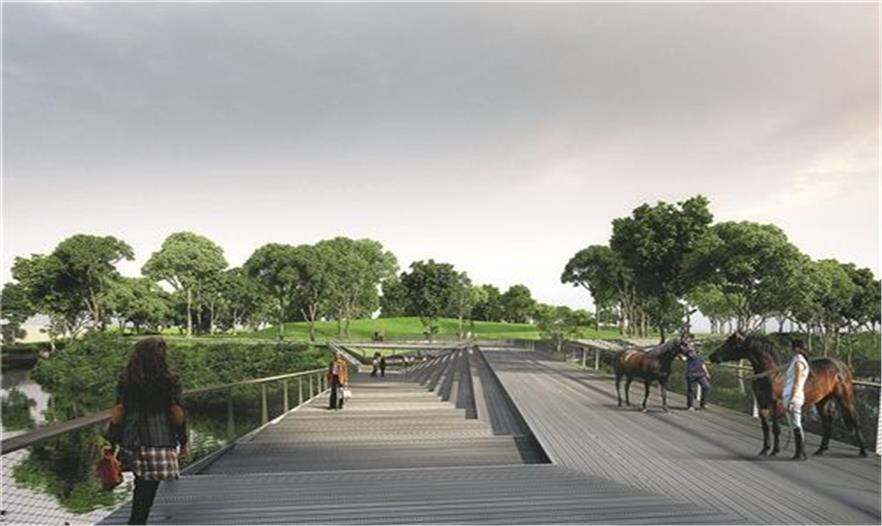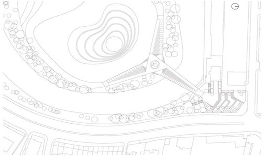 平面呈Y字形,由三個折疊平臺組成,其中一個平臺作為橋主體,其余兩個是向河面延展的坡道和平臺,它們包裹成景觀雕塑,并且引導(dǎo)行人走向已有的沿河人行道。整個結(jié)構(gòu)呈折疊狀,用來抵消歐韋爾河岸兩側(cè)4米的高差。平臺的疊放使橋體與草甸河岸產(chǎn)生輕柔的接觸。我們把這個方案看成草甸區(qū)未來發(fā)展的首要元素。它將成為一個多功能的元素,一個宜于沉思與娛樂的場所,一個漫步長廊和一個地標。