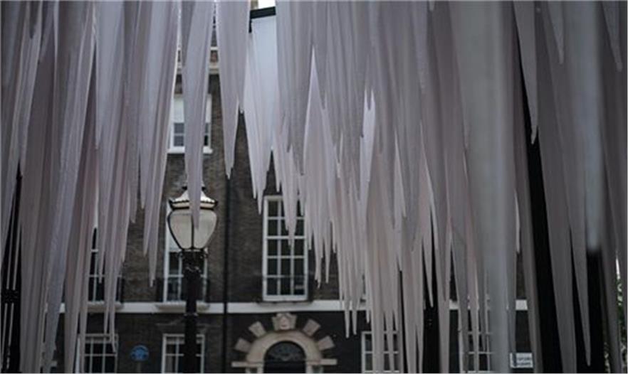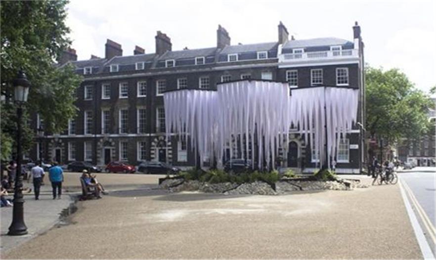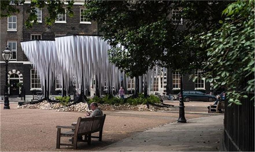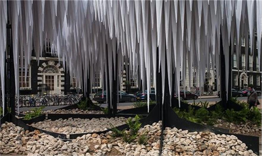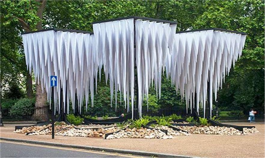智利-德國建筑團(tuán)隊GUN architects在倫敦的貝爾德福廣場設(shè)計了熱帶雨林館,它能形成了涼爽的小氣候,讓倫敦人們能夠在忙碌的城市生活中得以休息和放松。這個五米高的結(jié)構(gòu)是由7個圓柱組成,支撐著樹狀的冠層。這個裝置里最令人振奮的部分是它塑造的“鐘乳石”,懸掛于頂端,水滴到長有蕨類植物的石頭地面上。