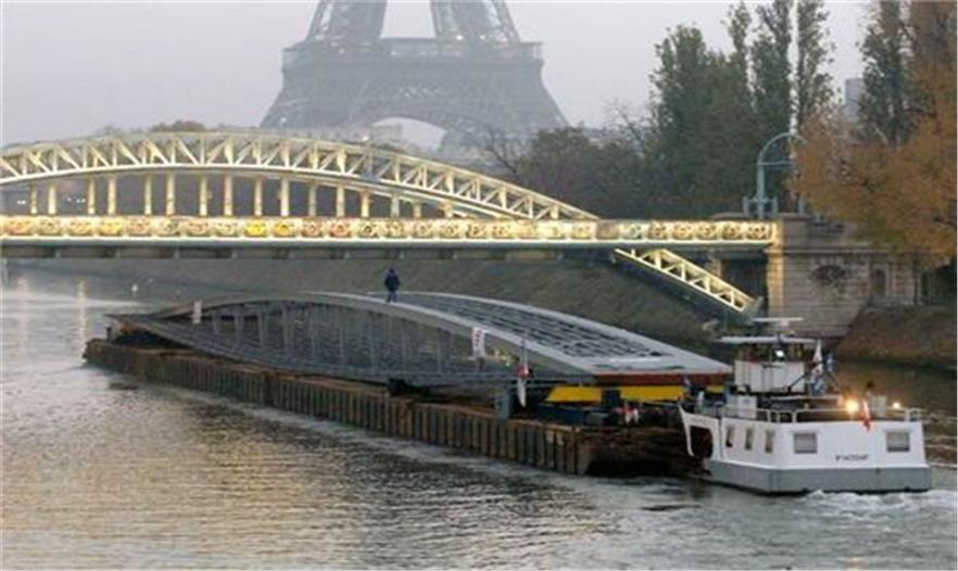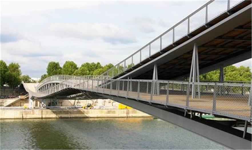 這個(gè)長“扁豆”的設(shè)計(jì)意味著它在特殊的鋼鐵制作車間里組合成一個(gè)單獨(dú)的部分,之后再運(yùn)到最終的地點(diǎn)。2006年6月28日,步行橋直接從巴黎的補(bǔ)給船中安裝完成,于2006年7月13日向行人和自行車開放。