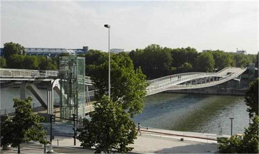 Dietmar Feichtinger設(shè)計(jì)的步行橋命名于法國偉大的女哲學(xué)家,她主張?zhí)岢畽?quán)主義。步行橋全長304米,自由跨度190米,成本花費(fèi)為2100萬歐元。巴黎人稱它為“l(fā)a lentille”——扁豆。這個(gè)昵稱顯示出了步行橋特殊的幾何結(jié)構(gòu);在沒有外部支撐的情況下,中央的跨度橫穿了河面,是懸吊與拱形結(jié)構(gòu)的合體。
