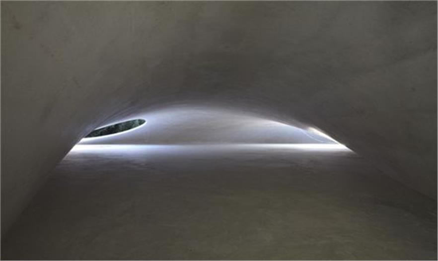 建筑的形狀看起來像一滴水滴,有薄薄的混凝土外殼,在盤旋回地面之前又微微的翹起。博物館有兩個(gè)橢圓形的門,這樣在空間里加入了許多自然的藝術(shù)元素,包括博物館地面上的雨水池。白天當(dāng)水順著建筑結(jié)構(gòu)滑落的時(shí)候,另一個(gè)藝術(shù)層也展示出來了。墻面本身只有10英寸薄,給整個(gè)建筑以精致之感。