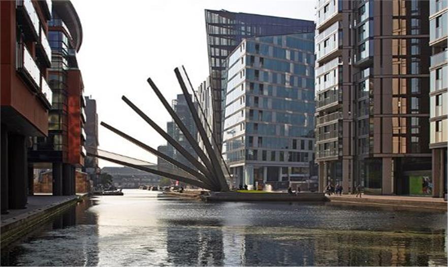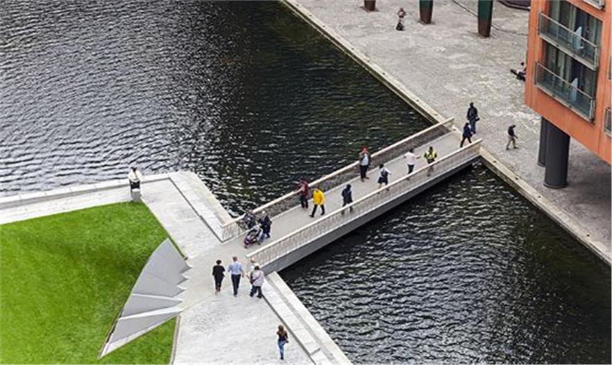 一座橋,如動感雕塑般出現(xiàn)在英國帕丁頓商業(yè)中心的運河上。5條鋼梁組成的橋面寬三 米,通過液壓千斤頂?shù)淖饔?,像東方扇子般開合。引人入勝的造型將建筑與景觀的品 質(zhì)再提升一個檔次。