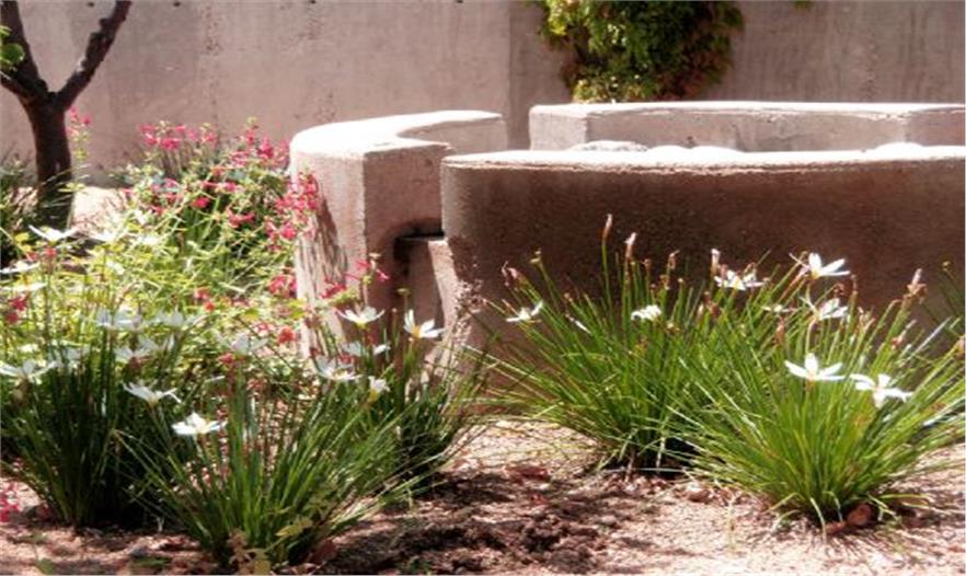 我們努力整合當?shù)夭牧?,增強本土野生動植物的生命力。光禿禿和腐蝕的道路被無節(jié)制的車輛交通被壞成那樣,用各種各樣的本土草本植物如格蘭馬草和藍牧草恢復(fù)其生氣。干旱的本土植物讓內(nèi)部有圍墻的花園富有生機,吸引了大量的本地鳥和蝴蝶。在斯托克頓堡附近播種生長的牧豆樹和沙漠柳樹以及其他耐旱植物是主要的沙漠植物。墻壁由牧場的沙子和石頭組成,關(guān)注本地的內(nèi)在美。除了苗床里的冰山玫瑰、山核桃樹以及果樹之外,所有的新植物可以在極度干旱的情況下生存下來。所有的這些努力設(shè)計出一個光滑但粗糙的景觀,使人類與環(huán)境健康達到平衡。