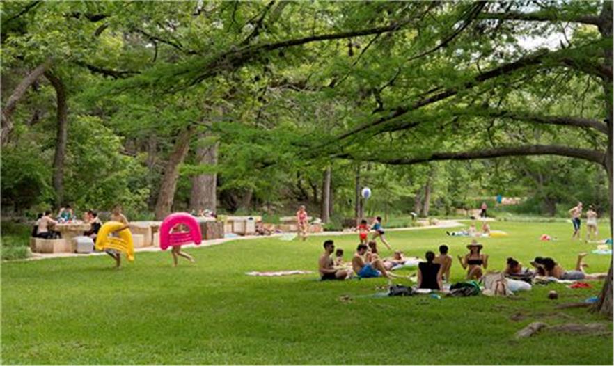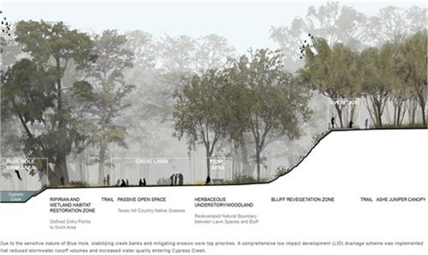 德克薩斯州郊野的藍洞石灰石地質(zhì)景觀區(qū)一直是當(dāng)?shù)靥厣穆糜涡蓍e景觀。其中游泳“holes”景觀區(qū)則是整個地質(zhì)區(qū)最受歡迎的去處,景觀設(shè)計師在這個項目中的任務(wù)是保護該地,對該區(qū)進行可持續(xù)的規(guī)劃和設(shè)計。