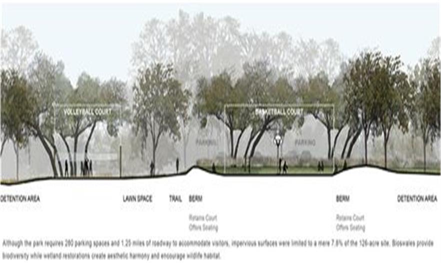 景觀設(shè)計師組織了生態(tài)學(xué)家,運營管理專家,維護專輯,工程師,建筑師(甚至再建筑方面整合了包括和建筑師配套的結(jié)構(gòu)師與機電暖通工程師等等專業(yè)人才),旨在實現(xiàn)高品質(zhì)環(huán)境的同時建立高品質(zhì)的建筑。經(jīng)過這個多樣化團隊的專業(yè)分析,具體工作內(nèi)容被制定,包括:改善兩個水域的水質(zhì),恢復(fù)其景觀生態(tài);清除農(nóng)業(yè)用地和康樂用地對場地造成的破壞;減少娛樂設(shè)施比如6個網(wǎng)球場,沙灘排球場,籃球場和慢跑線路對景觀的沖擊與影響;此外還包雨水管理,病蟲