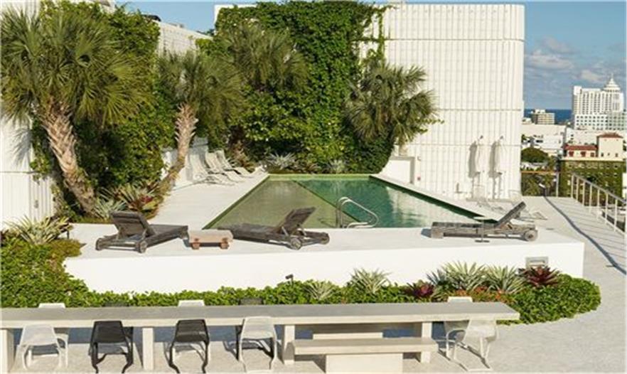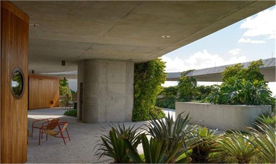 空中花園的東邊是休閑花園,周圍有酒吧、Architect設(shè)計的戶外用餐桌以及Landscape Architect設(shè)計的水池。開放的硬景觀區(qū)域是舉辦大型聚會的完美場所??罩谢▓@繼承了Landscape Architect 公司在1111林肯路上設(shè)計的公共廣場的實用性。白色的pedra portuguesa石頭是手砌的以及用灰泥涂抹的,而白色的河石劃分出了有機狀的花壇。停車場澆筑的混凝土塊發(fā)揮了地板、圓柱以及坡道的功效。