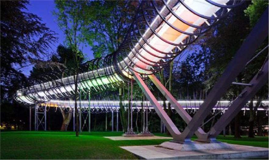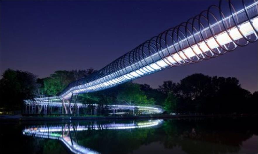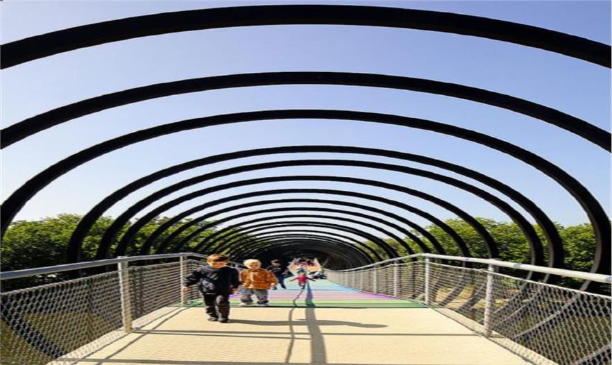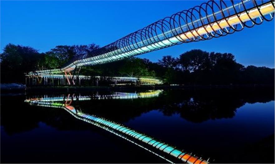 這座橋名叫“Slinky Springs To Fame ”,位于德國的奧伯豪森市,橫跨萊茵河。是由藝術(shù)家托比亞斯Rehberger和施萊克Bergermann設(shè)計(jì)而成,橋身共用了496個(gè)鋼圈,每到夜晚,彩燈亮起,人們在絢麗的橋中穿行,仿佛走在玩具橋中一樣。