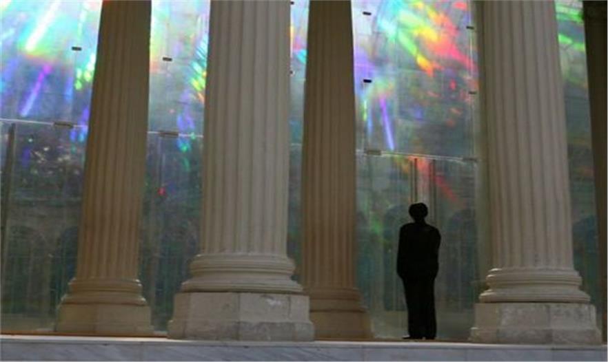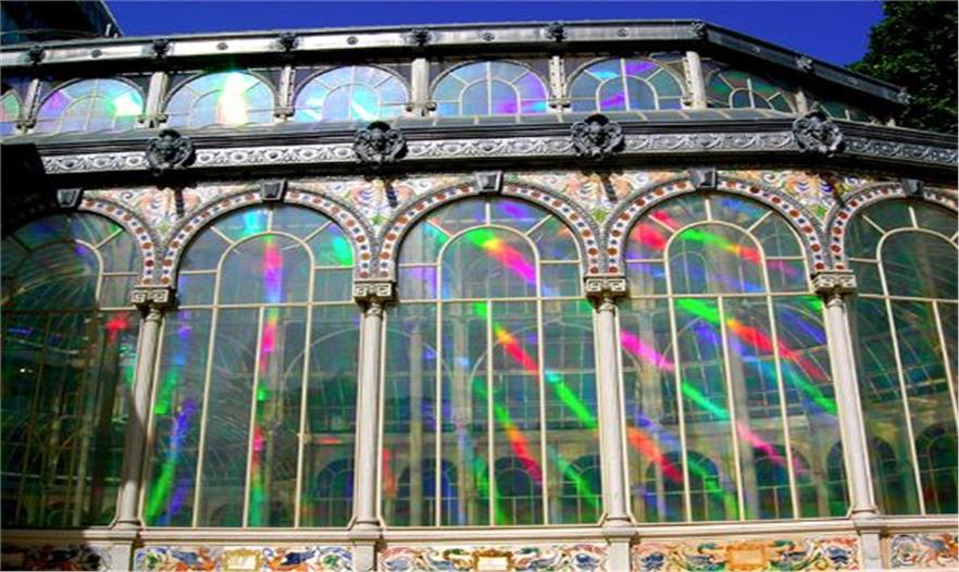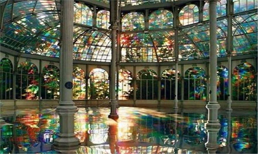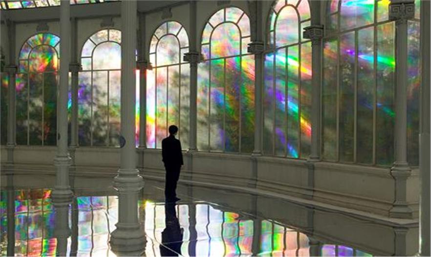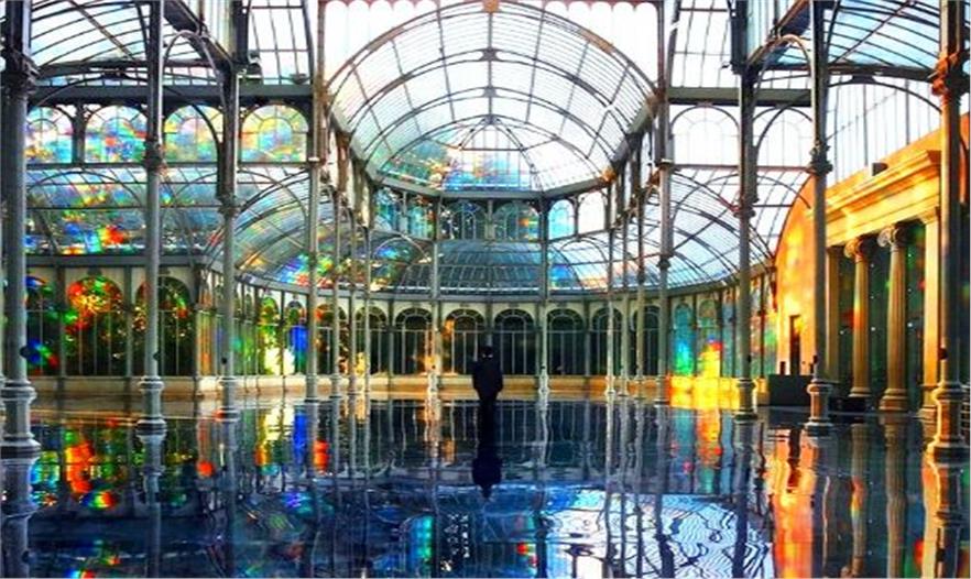 這個(gè)精致的裝置位于馬德里19世紀(jì)的溫室里,那里經(jīng)常收集著來自菲律賓的植物。Kimsooja把它轉(zhuǎn)變成一個(gè)顯著的、多種感覺體驗(yàn)的空間,但要用半透明的衍射薄層覆蓋住窗戶。這種材料產(chǎn)生了許多的彩虹效應(yīng),之后反射到覆蓋在整個(gè)地面的鏡面上。