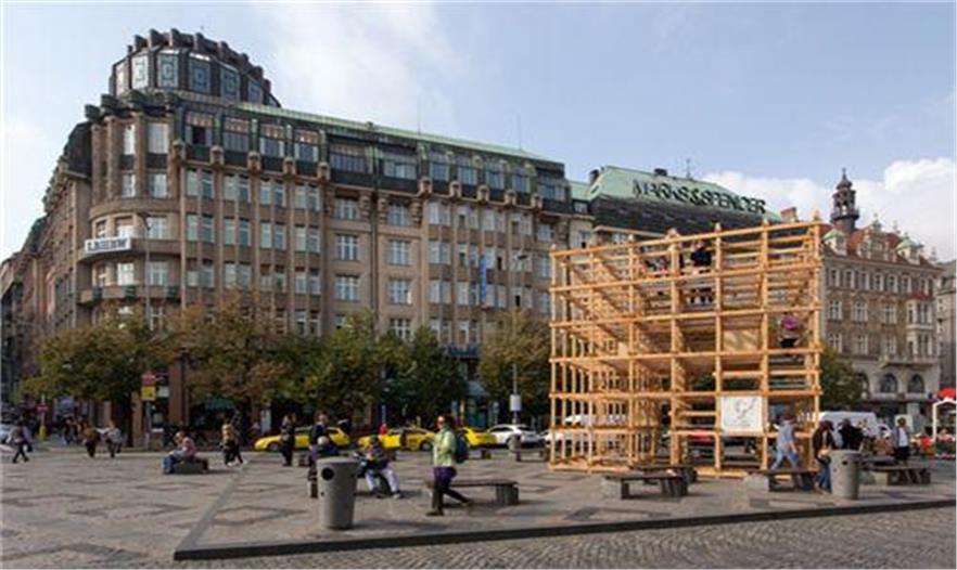 錯(cuò)綜復(fù)雜的木質(zhì)結(jié)構(gòu)就像一個(gè)巨大的多維迷宮一樣,金屬格柵作為著陸點(diǎn),游客們可以由此爬上并登上建筑的頂端。好奇的行人、游客和當(dāng)?shù)厝丝梢杂猛瑯拥姆绞?,在開(kāi)放的建筑中漫步向上。天然材料交織的網(wǎng)狀結(jié)構(gòu)同時(shí)遮擋并重新構(gòu)筑了城市中心。在建筑最頂端的觀察區(qū)域,可以對(duì)布拉格著名的街道和景點(diǎn)一覽無(wú)余,俯瞰著名的前新藝術(shù)派evropa大酒店。該酒店是承辦designblok活動(dòng)的5個(gè)非常規(guī)地點(diǎn)之一,酒店房間是60個(gè)個(gè)體生產(chǎn)者和品牌的展覽空間。