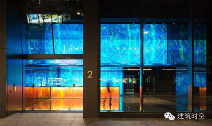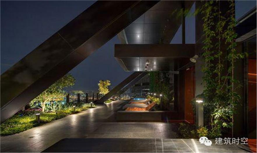 “中央花園”東側(cè)塔樓處最有特色的是有一個懸臂式的反射裝置,即日光反射裝置。該裝置由320個固定的、機(jī)動化的紅外線鑲嵌板組成,用來將太陽光折射到區(qū)域內(nèi)任何一個被陰影覆蓋的地方。到了晚上,日光反射裝置變成一個非?,F(xiàn)代化的吊燈,好像一個池子懸浮在夜空中,其中LED燈光閃爍好像依然在反射日光,塔樓呈現(xiàn)出色彩斑斕的夢幻景象。