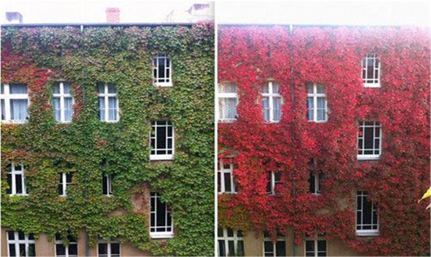 爬滿公寓外墻的樹葉,隨著時間變換顏色替大樓穿上紅色外衣。