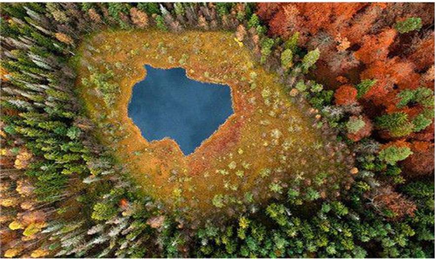 空拍波蘭森林湖的由綠轉紅、由外而內的美麗變化。