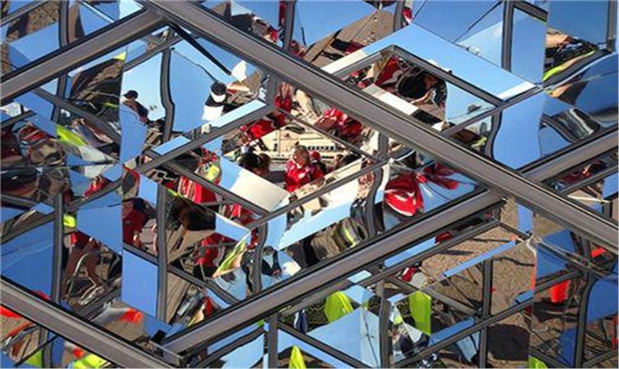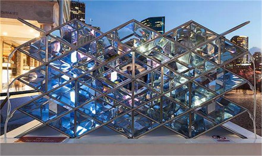 Rathod的這個(gè)4英尺深的Kaleido Wall是由覆蓋在反射板上的格子組件構(gòu)成,來反射燈光和運(yùn)動(dòng),創(chuàng)造出顏色的變換。這個(gè)結(jié)構(gòu)運(yùn)用了周圍的燈光反射資源,在白天或是夜晚都能看見。這個(gè)裝置能反射出悉尼港的即時(shí)景象,讓游客在小型的拼圖結(jié)構(gòu)中觀賞到標(biāo)志性建筑物——悉尼歌劇院。