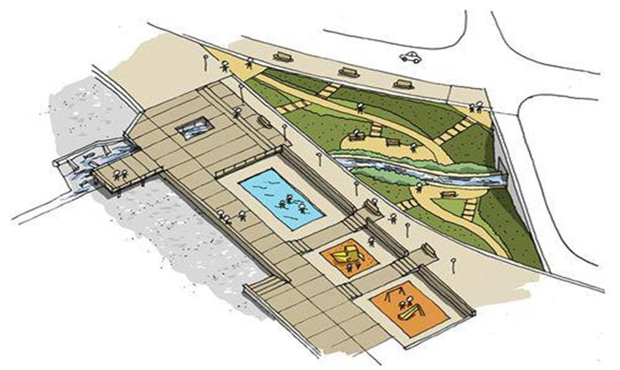 釋放河流的價(jià)值。最后階段要顯現(xiàn)出河流,因?yàn)樗婚_鑿了水道并隱藏在了停車場(chǎng)下面。拆毀停車場(chǎng),在河流沿線建造一個(gè)淡水花園。
