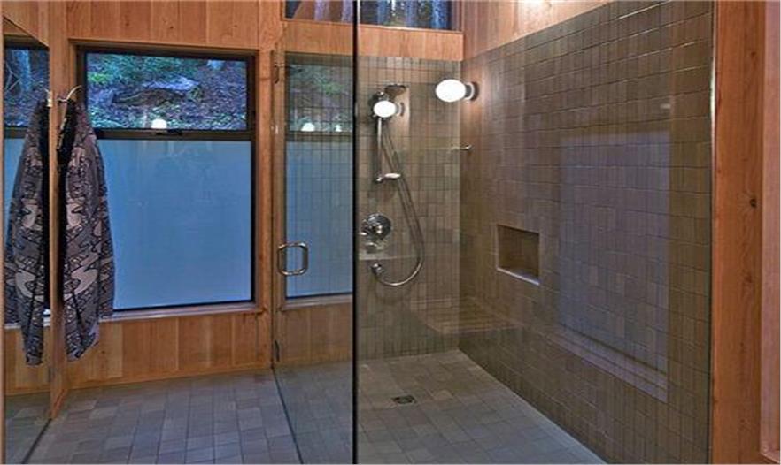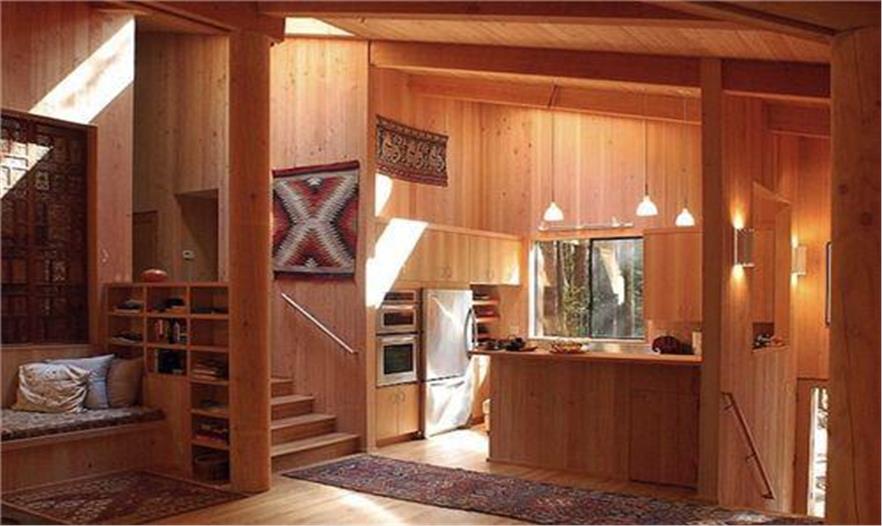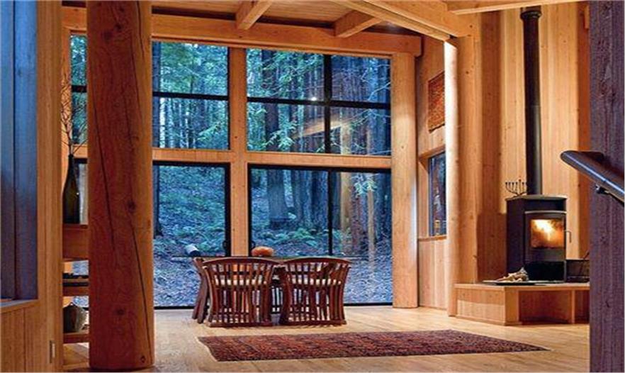 到室內(nèi)就立刻被兩倍高、接近落地的玻璃板吸引了目光,是用來打開客廳來觀賞紅杉林景象以及模糊室內(nèi)與戶外生活的界限。樹干形狀的圓柱體支撐著室內(nèi)的大梁,給人以室內(nèi)森林的感覺。旋轉(zhuǎn)的木質(zhì)火爐安置在墻角,緊接著是由印度帶來的金銀細(xì)絲工藝的木質(zhì)屏風(fēng)。