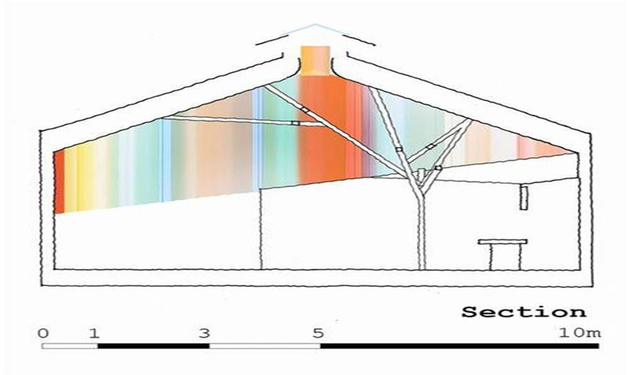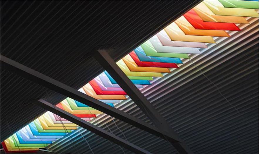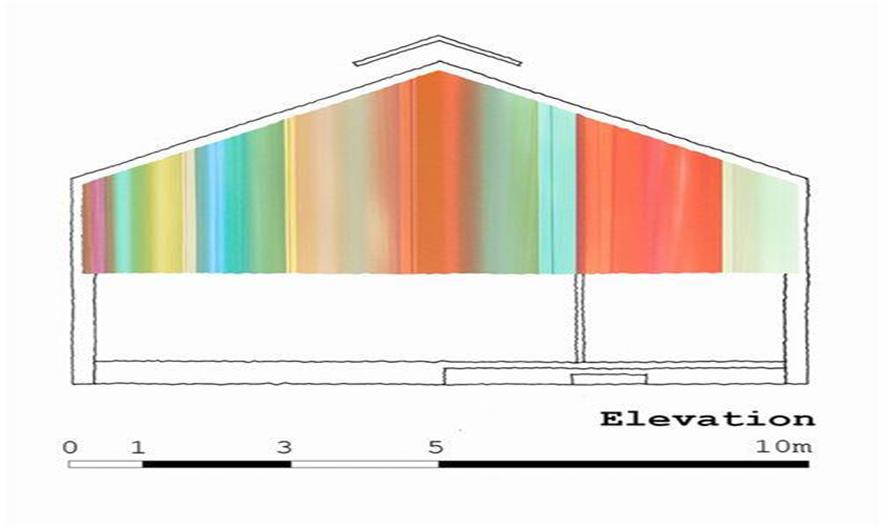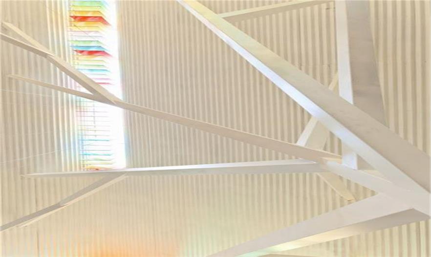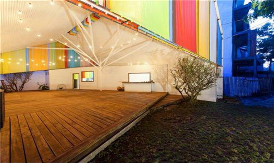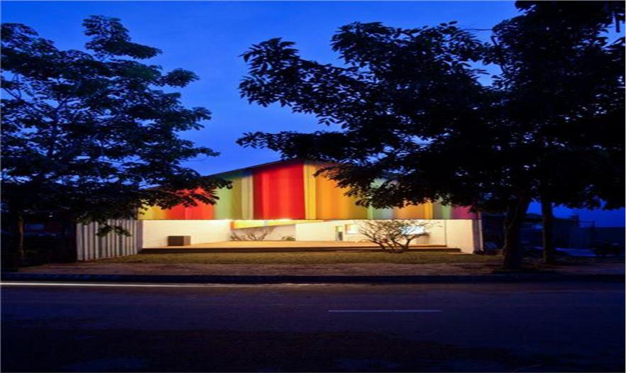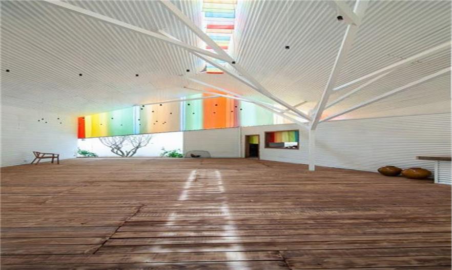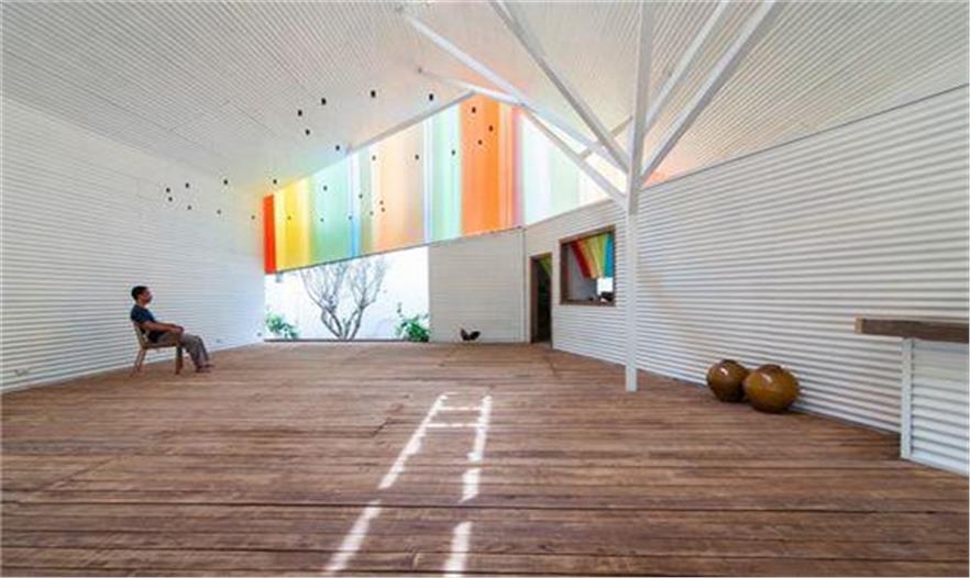 三層印有各種顏色的半透明紡織物覆蓋在窗子上,讓室內(nèi)空間產(chǎn)生了如彩虹般的光影效果,外觀看上去也有了傳統(tǒng)教堂常用的彩色玻璃窗。中心內(nèi)容納了一個(gè)咖啡廳、家具回收處、廚房以及一些公共設(shè)施。沒有奢華浪費(fèi),沒有夸張?jiān)熳?,是一座?shí)實(shí)在在物盡其用的小房子,用低廉的材料創(chuàng)作出一片歡樂。