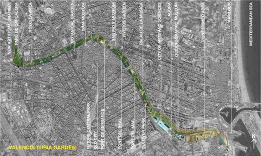 圖里亞花園是明確的顯現(xiàn)出城市里各種設(shè)施和紀(jì)念物的空間,不僅在邊界(IVAM現(xiàn)代藝術(shù)博物館、Pio V美術(shù)博物館、塞拉努斯的中世紀(jì)塔樓、植物園、Viveros花園、購(gòu)物中心、政府大樓、音樂宮、動(dòng)物園等等……)而且在河床里面,有運(yùn)動(dòng)場(chǎng)、孩子們玩耍的地方或者是聞名的藝術(shù)科學(xué)城。