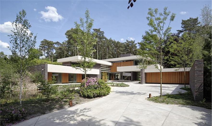 該地塊存在三個方面的特點(diǎn):朝向馬路的茂密植被,屋前大面積的空地,基地后面開放式的松樹林。從場地北邊的“Utrechtse Heuvelrug”山丘開始,場地存在6米的高差。我們遵循了三個部分的劃分。別墅的不同體塊都坐落在空地和山丘北部和東部邊界,車庫和長條形花園的墻圍合出一個種植庭院,這也是地塊中唯一一處人造景觀的區(qū)域。