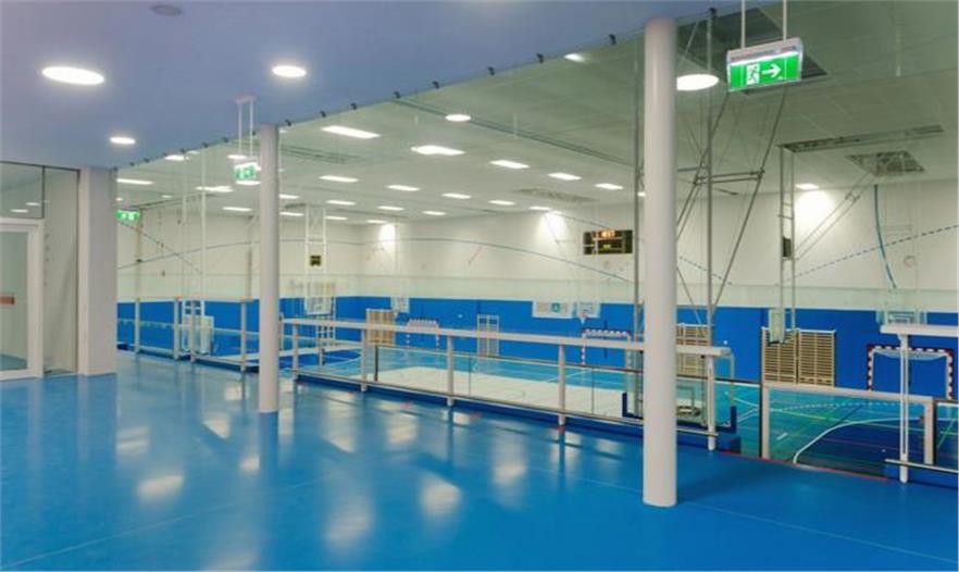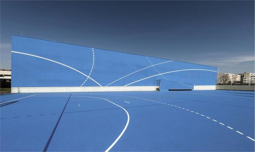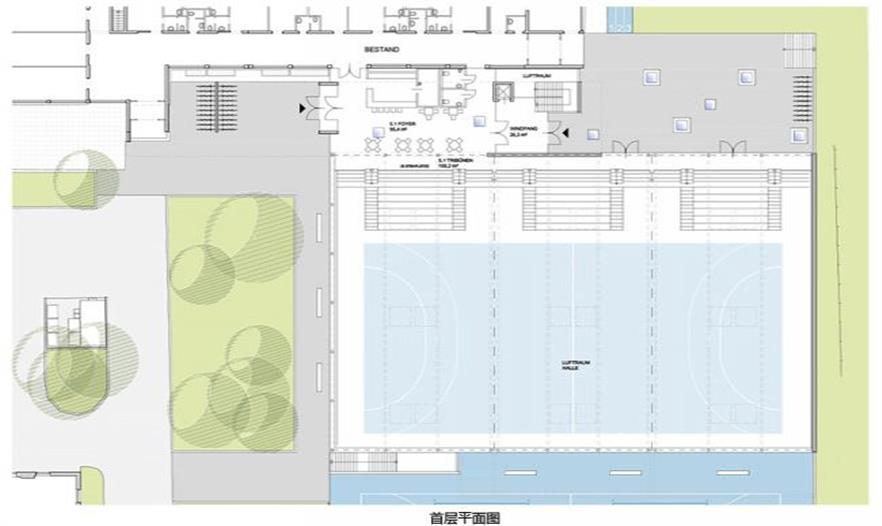 固定的看臺區(qū)設計有300個座位和6個額外的輪椅坐席空間。三個座位可伸縮的看臺新增了264個座位,合計可容納566名觀眾。體育館與運動區(qū)域的結合是城市空間設計中的重要因素:體育館立面采取同樣結構的藍色表面,并覆有橡膠涂層。統(tǒng)一化的設計在學校場地上創(chuàng)造了一個入口區(qū)域?;咨系乃綌鄬硬捎貌Al帶的形式,既能夠被照明又使結構看上去十分輕盈。