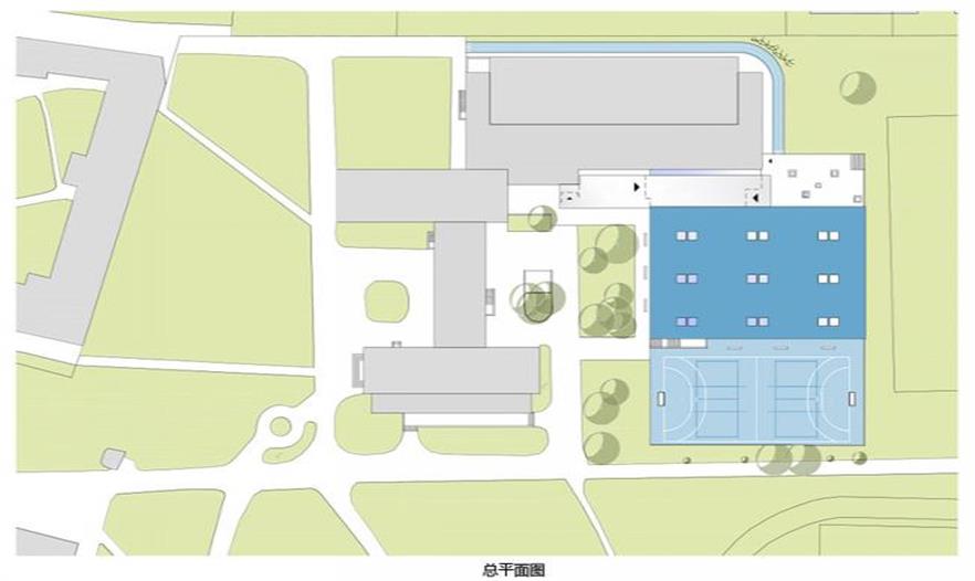 入口設計一方面嚴格區(qū)分了學校人員通道和外部人員通道,另一方面,將觀眾與運動員區(qū)分開來:外部用戶、組織人員、運動員經由場地北側的跑道進入體育館,并從新的東北方前院進入建筑,以保證不會用到現有的學校建筑,不會打擾到學生上課。