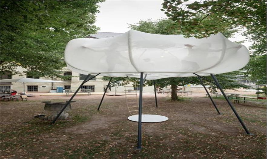 這個半透明的白色結(jié)構(gòu)位于大學(xué)校園的林區(qū),由地面上的鐵支架支撐,讓游客置身在和附近樹木枝干的同等高度上。這個趨向于雨云的結(jié)構(gòu)由彈性的多孔材料制成,讓人們接觸降水,而不是保護他們避免雨淋。