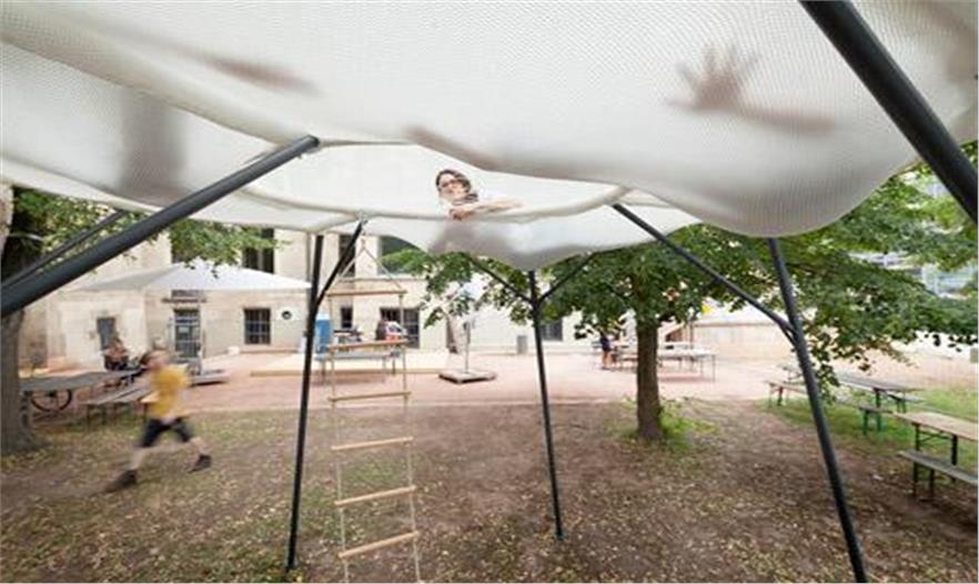 這個管狀的鋼鐵框架很容易組合和分離,因為它被包裹在一個白色且有彈性的間隔紡織品里面——是德國紡織廠公司3DEA生產(chǎn)的可以呼吸的多孔聚酯材料——能夠與人們產(chǎn)生互動。