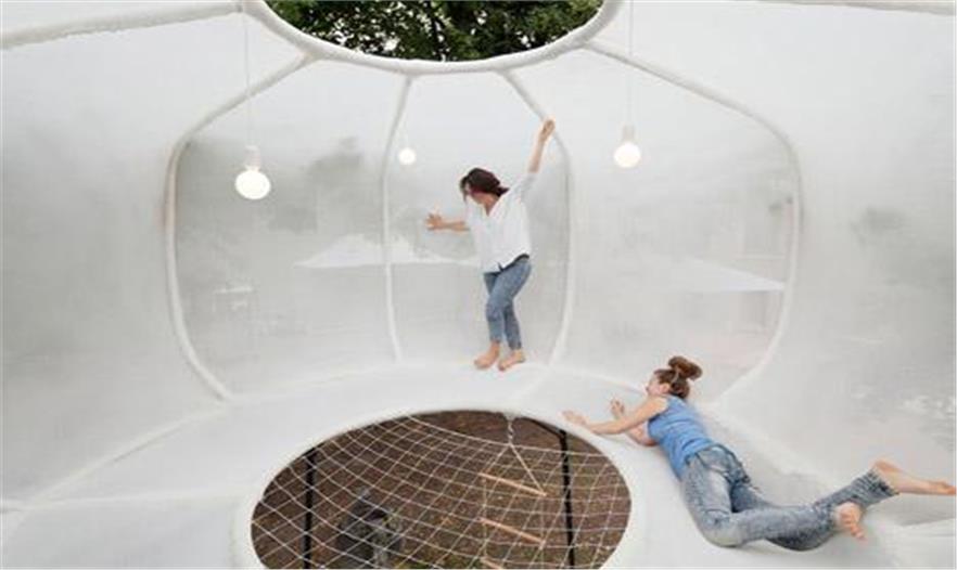 這個裝置可透的紡織表層是由德國伯格戈壁新斯坦藝術(shù)設(shè)計大學(xué)的畢業(yè)生設(shè)計的,讓空間保持濕度,讓游客感覺到他們在云中一樣。